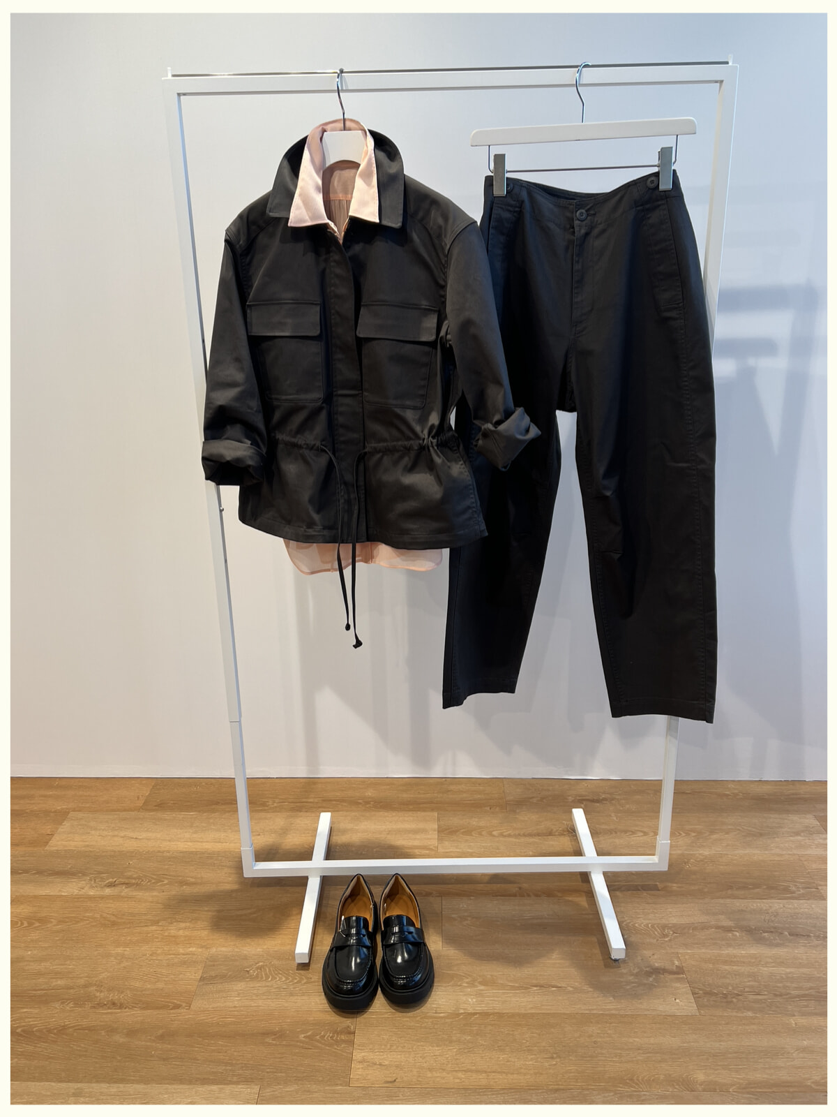 現実に戻って、仕事でも使えるコーディネートを。絶対欲しいと思ったドローストリングジャケットは、ワークウエアのエッセンスを取り入れながらもミニマルなシルエットでエレガントな一枚。同素材のパンツをセットアップとして合わせるのがおすすめです。先ほどのバカンス用コーディネートで使ったピンクのシャツをジャケットの下にレイヤードして軽やかな抜け感を添えました。秋冬コレクションでも登場していたローファーは、春夏コレクションでもラインナップしていてこちらも即買いを決意。ソール部分のクッション性が抜群で、とにかく歩きやすいんです。