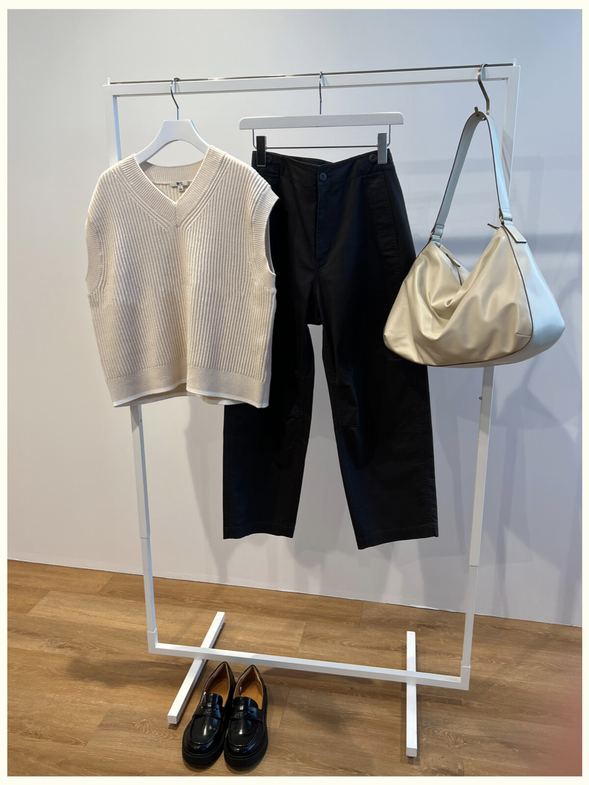 ボーイズライクなシルエットのパンツは、ざっくりとした編み地と太幅のリブベストで仕上げたシックなモノトーンスタイルで着回そうと考えています。こちらのVネックベストは、シャツとレイヤードしても一枚で着ても使える万能アイテム。シンプルながら細部まで計算されたシルエットの美しさ、心地よい肌触りで毎日着たいウエア。着回力抜群の新しいアイテムを迎えて、フレッシュな気持ちで新しい季節を迎えたいと思います。
