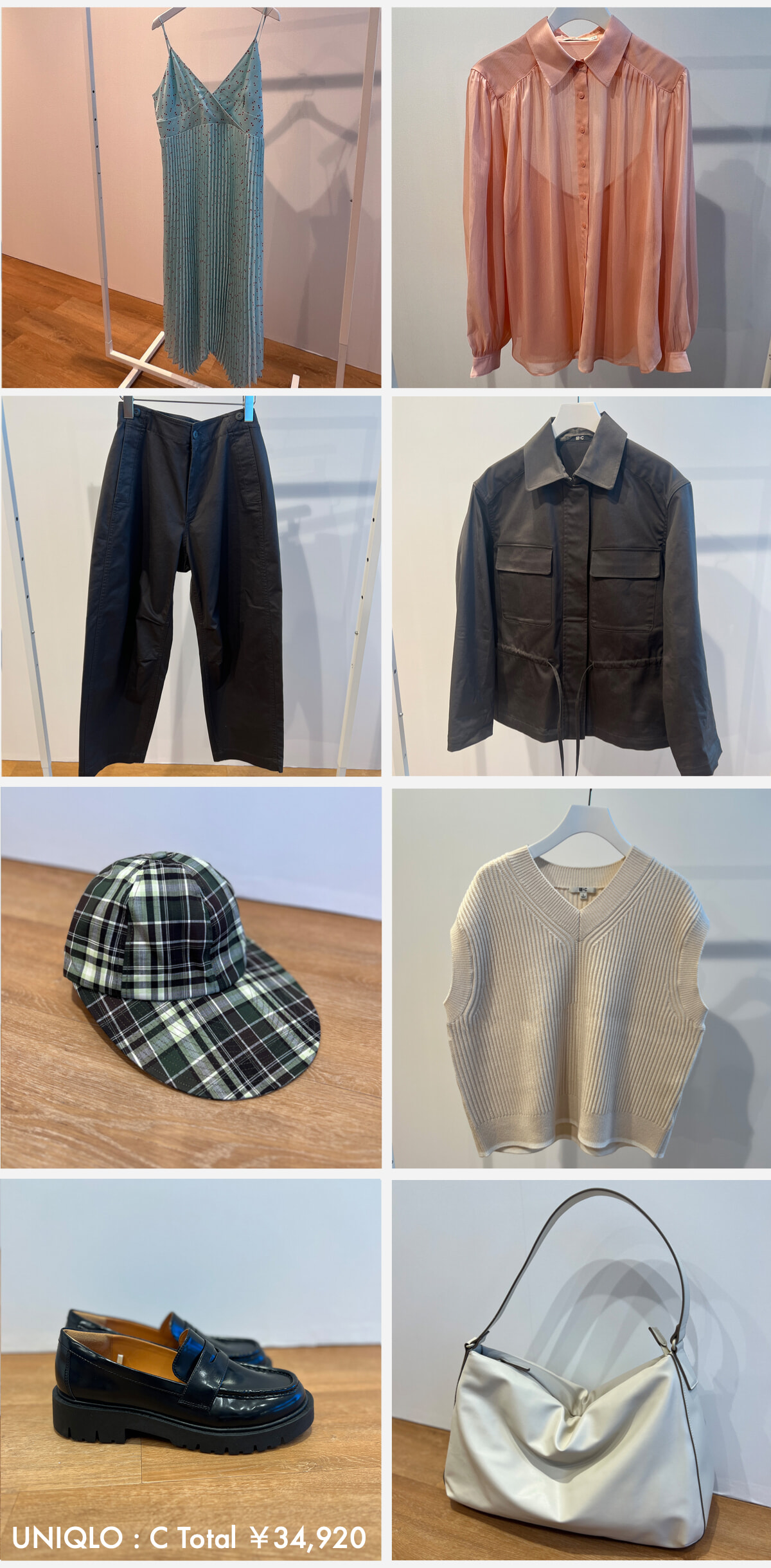 結果からお伝えします。¥35,000あればサマーコレクションを待たずして、春夏を通して過ごせるワードローブが完成します! 購入したのは、鮮やかな水色のドレス、ピンクのシャツ、セットアップのジャケットとバンツ、ニットベスト、つば広のキャップ、バッグ、そしてローファーという小物まで入った計8点。これだけ購入しても予算内の¥34,920です!