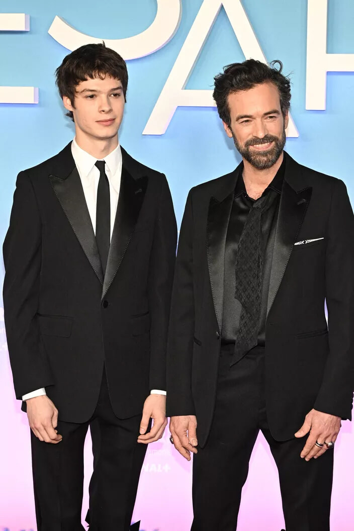 第49回セザール賞授賞式でセリーヌとブシュロンのブローチを身につけたロマン・デュリスとセリーヌを着用したポール・キルヒャー。(パリ、2024年2月23日)