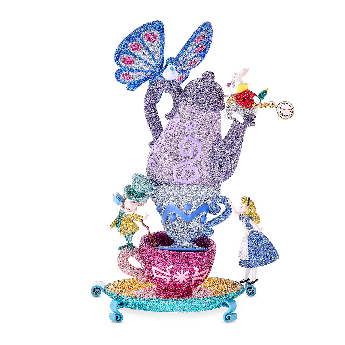 今回のコラボレーションの一環として豪華な限定品も登場。スワロフスキーならではの技法で、44,500個以上の精密カット・クリスタルを手作業でセッティング。スワロフスキーの芸術性が発揮されたこのティーパーティーは「ふしぎの国のアリス」の魅惑的な世界を表現している。完成までに277時間を費やしたこの作品は、世界限定200個で販売。¥2,530,000/スワロフスキー・ジュエリー(スワロフスキー・ジャパン)