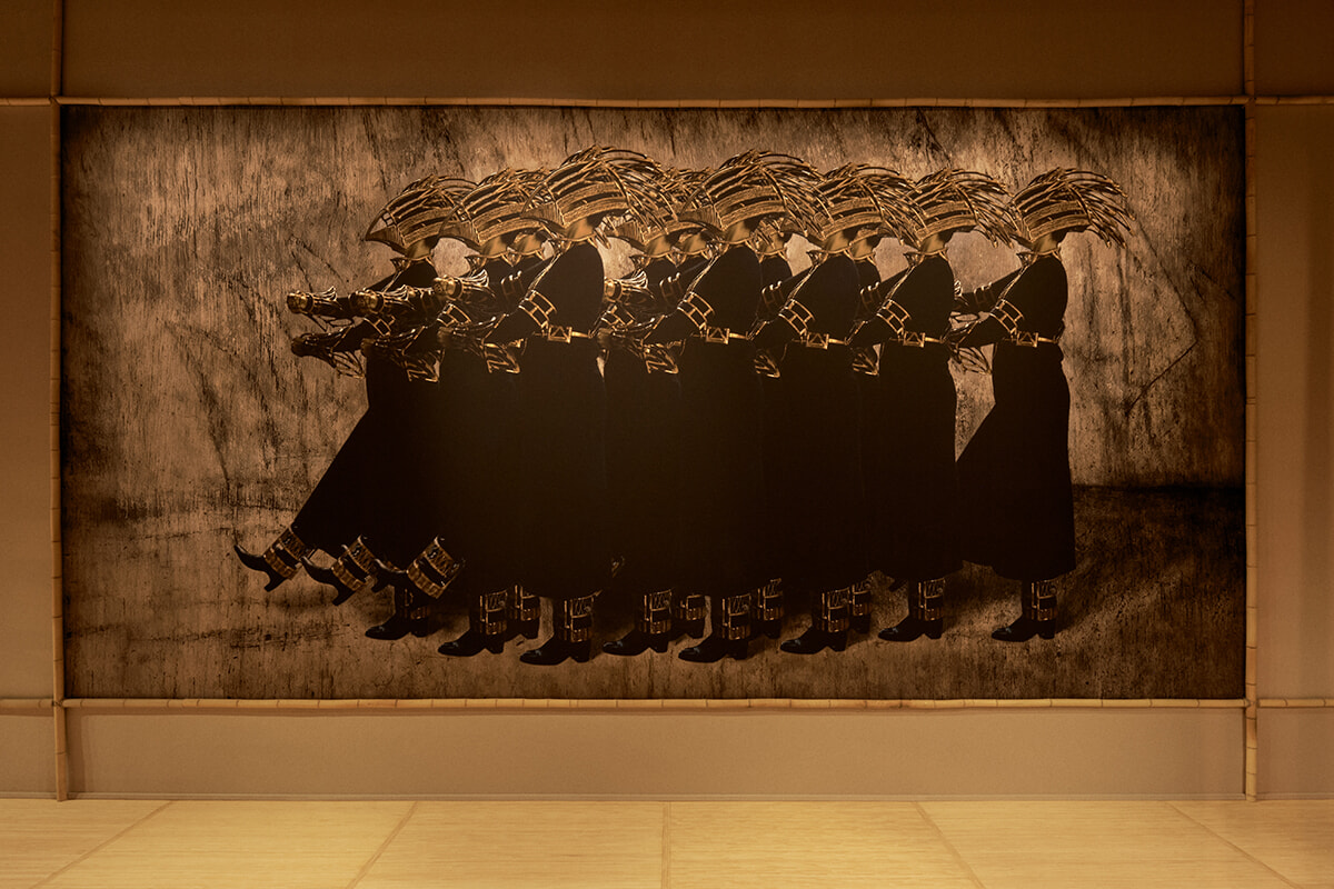 会場の中心には彼女のシリーズ作品「OF BODIES, ARMOUR AND CAGES」から、9体の籐製の人物像がインスタレーションされ、2重のサークルになった会場は、竹の仕切り壁と天井に覆われている。外周の壁を飾るのは、籐の鎧を纏って踊る女性たち姿を写した巨大パネルだ。闘う女性のイメージを描く舞台装飾または、シノグラフィが、パワフルなフェミニニティを予感させる。