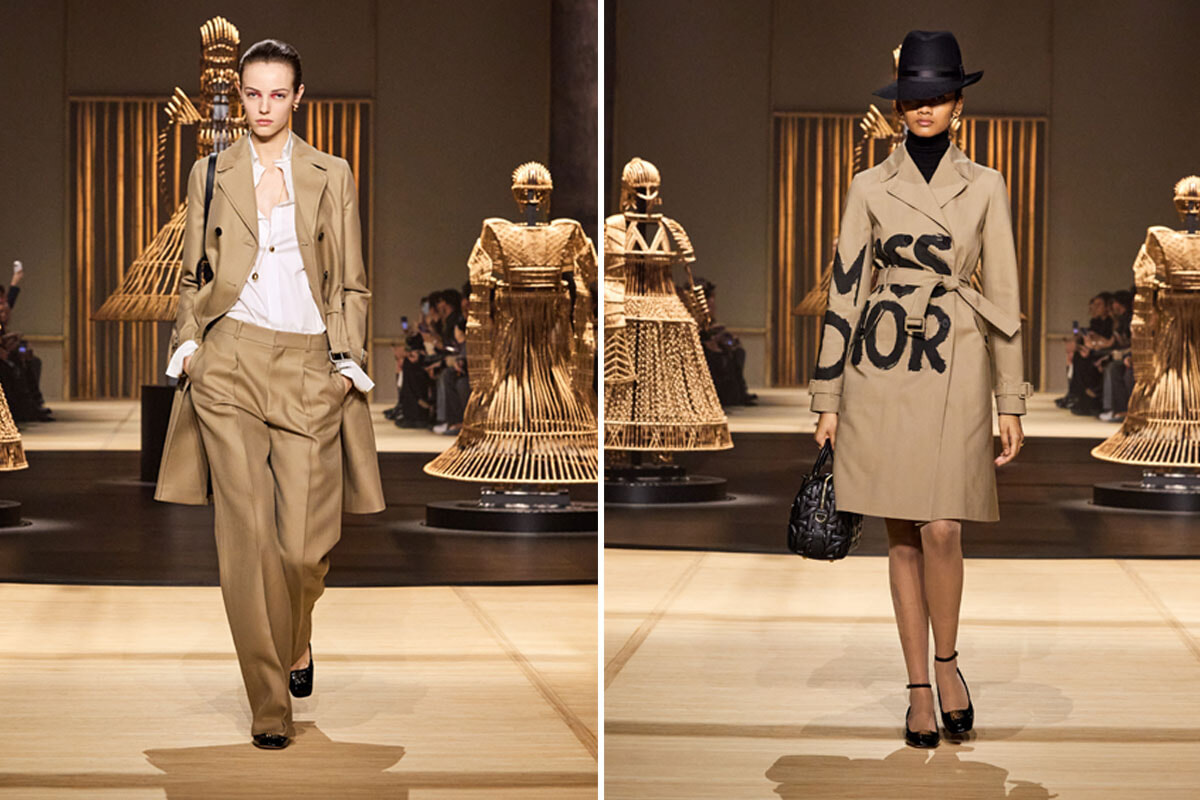 ファーストルックは、メンズライクなベージュのパンツスーツ。続いて、「MISS DIOR」の文字が書かれた膝丈のトレンチコートが登場し、黒とベージュ、シンプルでシックなルックがショーの幕を開けた。仕立てのいいジャケット、トレンチ、膝丈のタイトスカートやメンズライクなパンツに白シャツや黒のトップスを合わせ、女性のためのパーフェクトなワードローブが提案されている。