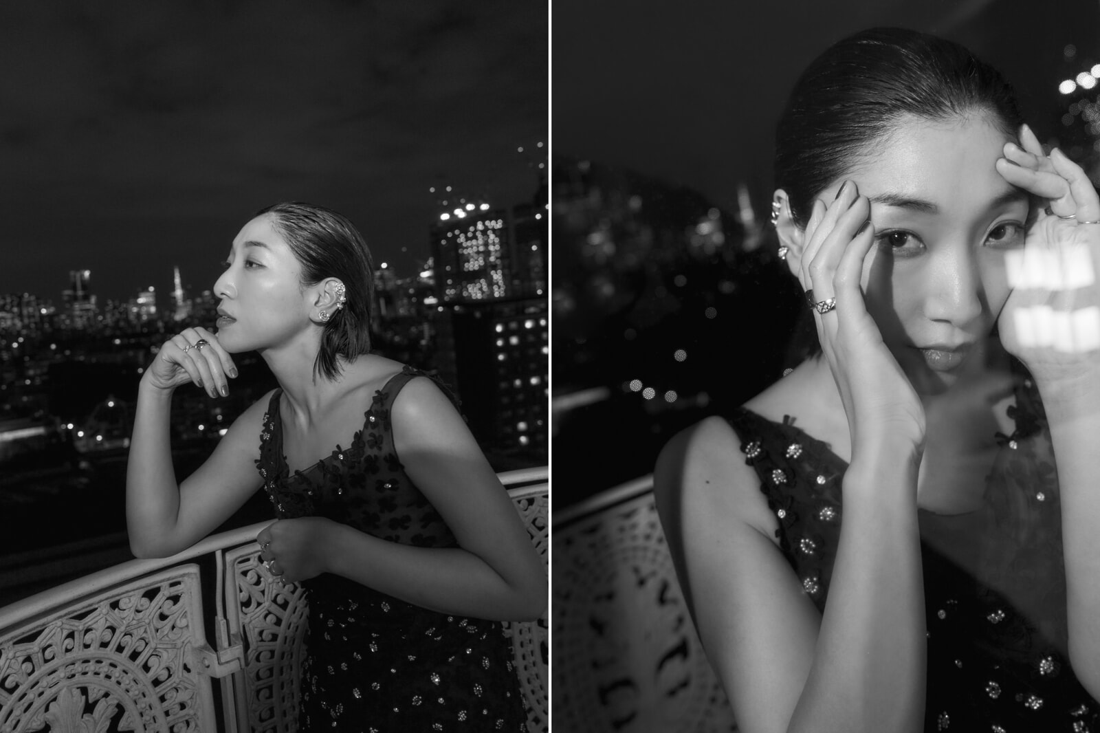 煌めくドレスをさらに輝かせたのは至高のジュエリー。18Kホワイトゴールドとダイヤモンドの「カメリア コレクション」イヤリングをはじめ、「ココ クラッシュ」イヤリングやリング、「コメット コレクション」リングをコーディネートし、繊細な美学が宿るエレガンスを漂わせた。
