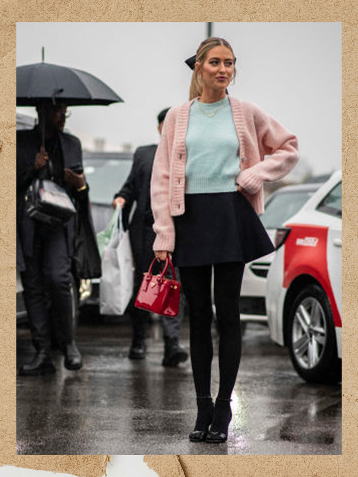 パステルカラーのニットにフレアスカートを合わせてキッチュなガール風に。スタイリッシュに脚見せをしてこそ大人のミニスタイル。