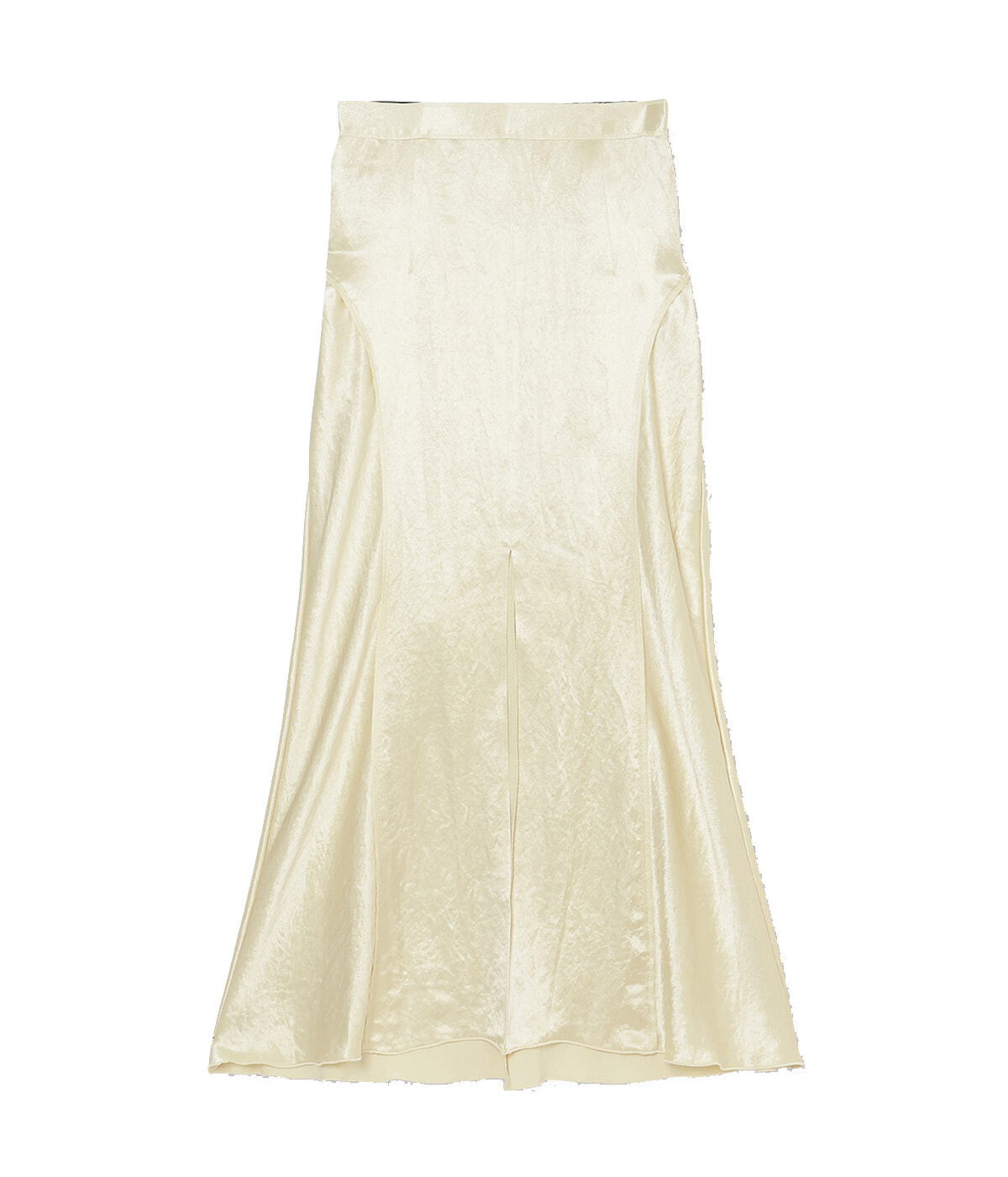シルキーな艶感と柔らかさのあるアセテートサテン素材マキシスカート。フロントに深く入ったスリットとカービィな切り替えが、上品でセンシュアルなムードを醸す。