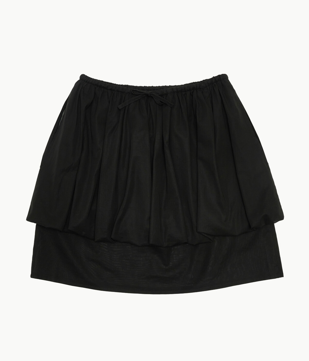 バルーンスカートとタイトスカート、清涼感のある2つのシアーコットンを重ねた多面性のあるデザイン。爽やかに腰回りを主役にできる一着。