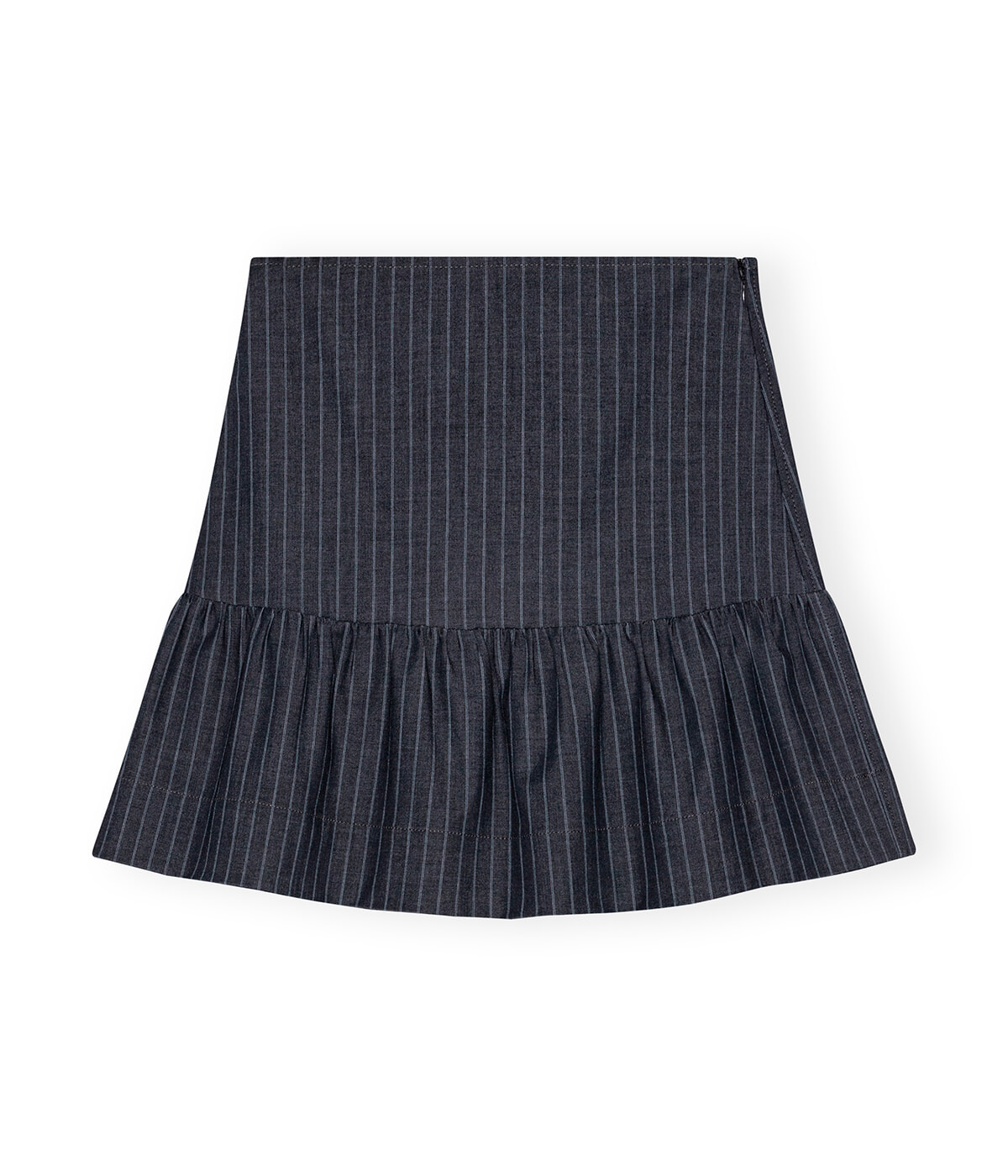 カレッジライクなテイストを取り入れたいならこんなピンストライプ柄のミニスカートを選びたい。裾に寄せたギャザーがアクセント。ストレッチ性のあるリサイクルポリエステルとビスコース混ツイルで履き心地が◎