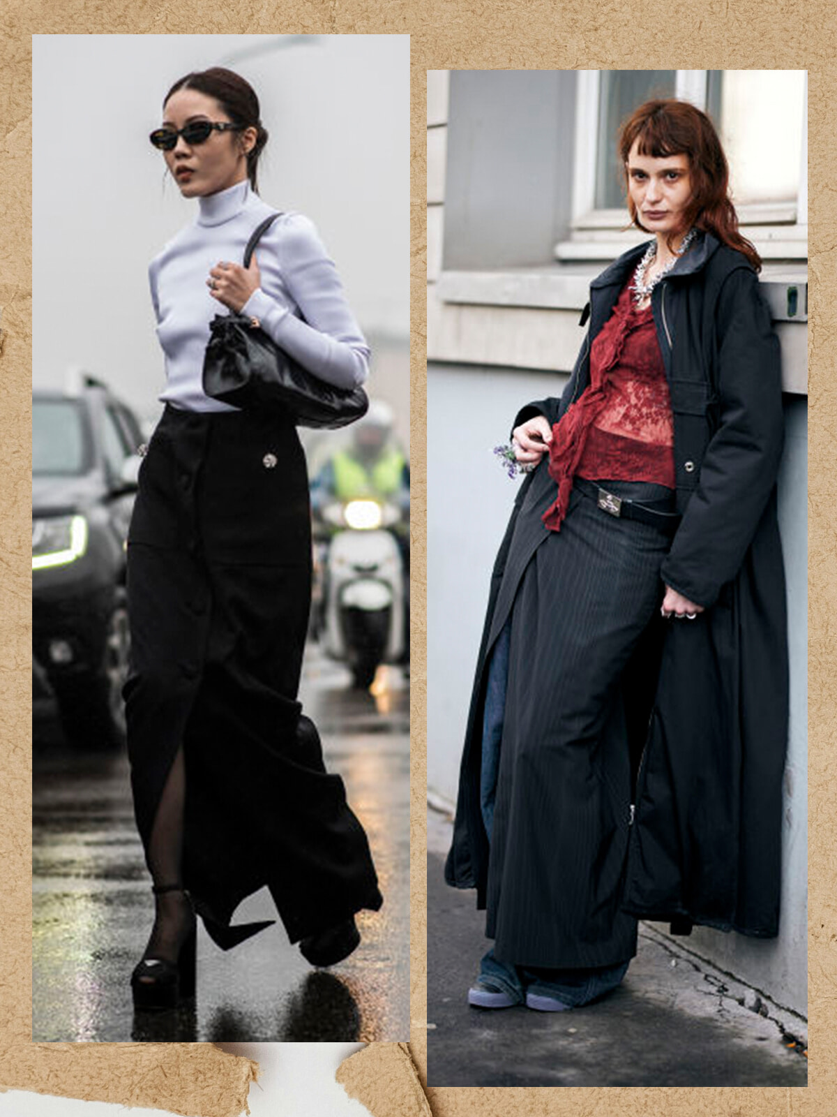 (左)レッグコンシャスを強調するのはミニ丈だけにあらず。タイトシルエットやスリットから覗くセクシーなタイツも美しい足元を演出する。(右)大胆なスリットのラップスカートはジーンズを重ねてボトムの重量感を際立たせるのも手。