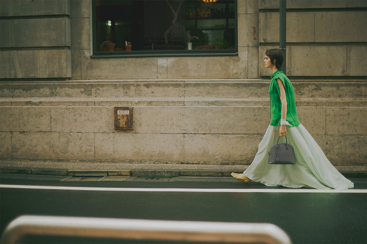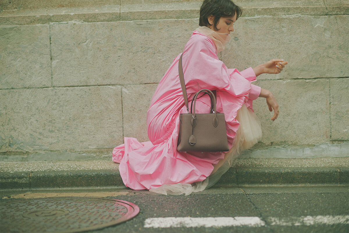 「ミア トートバッグ 30 シュリンクレザー」エトープ(H21×W30×D13cm)¥209,000(3/21発売)/ボナベンチュラ(ボナベンチュラ カスタマーサポート) ドレス¥115,500/ダウェイ(メゾン・ディセット) 中に着たトップ¥108,900、スカート¥154,000/ともにファビアナフィリッピ(アオイ) ピアス¥209,000、右手リング¥385,000/ともにジョージ ジェンセン(ジョージ ジェンセン ジャパン)