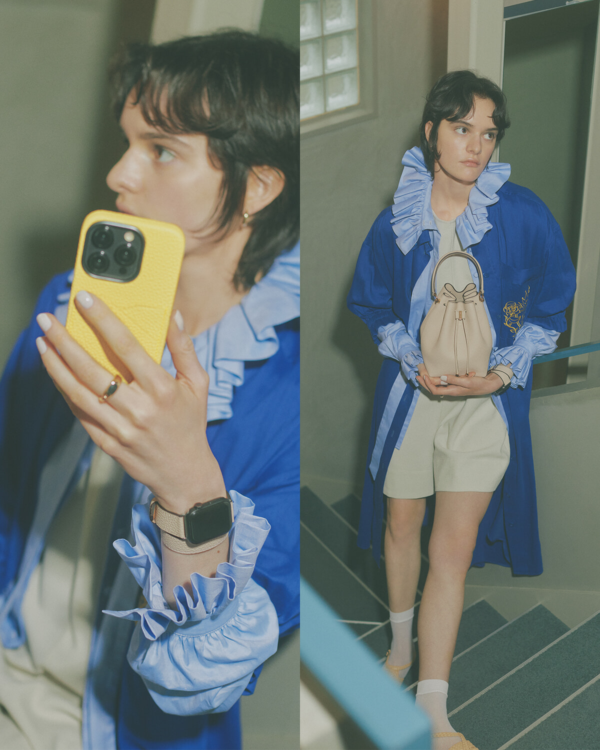 「アンジェリカ バケット バッグ シュリンクレザー」アイボリー(H20.5×W13.5×D12cm)¥143,000、「バックカバーケース シュリンクレザー」イエロー¥14,300~(サイズにより価格は異なる)、「ダブルトゥール Apple Watchレザーバンド」アイボリー¥19,800/以上ボナベンチュラ(ボナベンチュラ カスタマーサポート) シャツワンピース¥179,300、中に着たシャツ¥157,300/ともにプルーン ゴールドシュミット(メゾン・ディセット) オールインワン¥28,600/アダワス(ショールーム セッション) ピアス¥198,000、リング¥407,000/ともにジョージ ジェンセン(ジョージ ジェンセン ジャパン) ソックス¥4,400/ウォルフォード(サザビーリーグ) シューズ¥89,100/ヘリュー(ショールーム セッション)