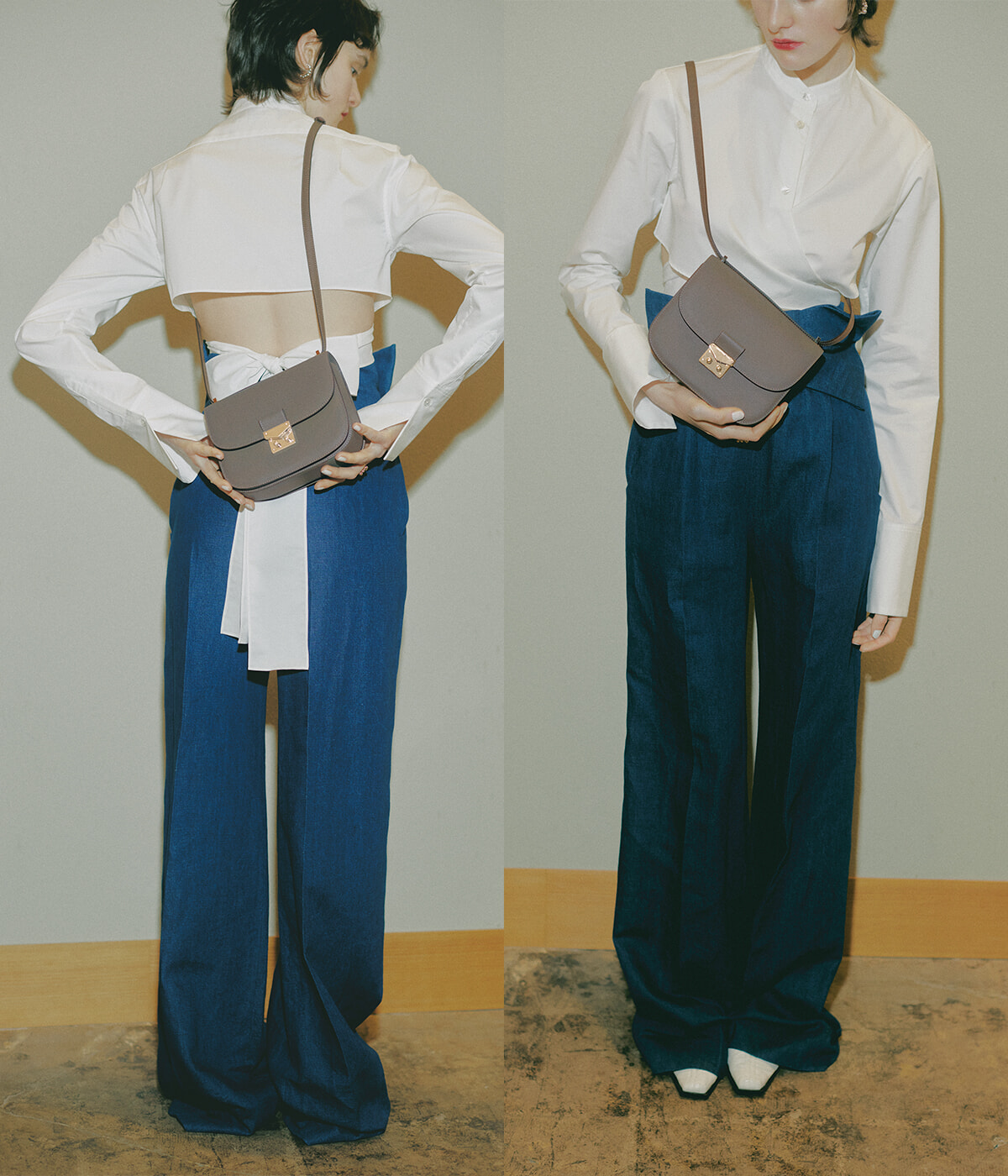 「ステラ ショルダーバッグノブレッサレザー」エトープ(H16×W20×D7.5cm)¥209,000/ボナベンチュラ(ボナベンチュラ カスタマーサポート) シャツ¥37,400/チノ(モールド) パンツ¥238,700/プルーン ゴールドシュミット(メゾン・ディセット) ピアス¥46,200、右手リング¥385,000/ともにジョージ ジェンセン(ジョージ ジェンセン ジャパン) シューズ(参考色、商品はブラックで展開)¥74,800/ハルノブムラタ(ザ・ウォール ショールーム)