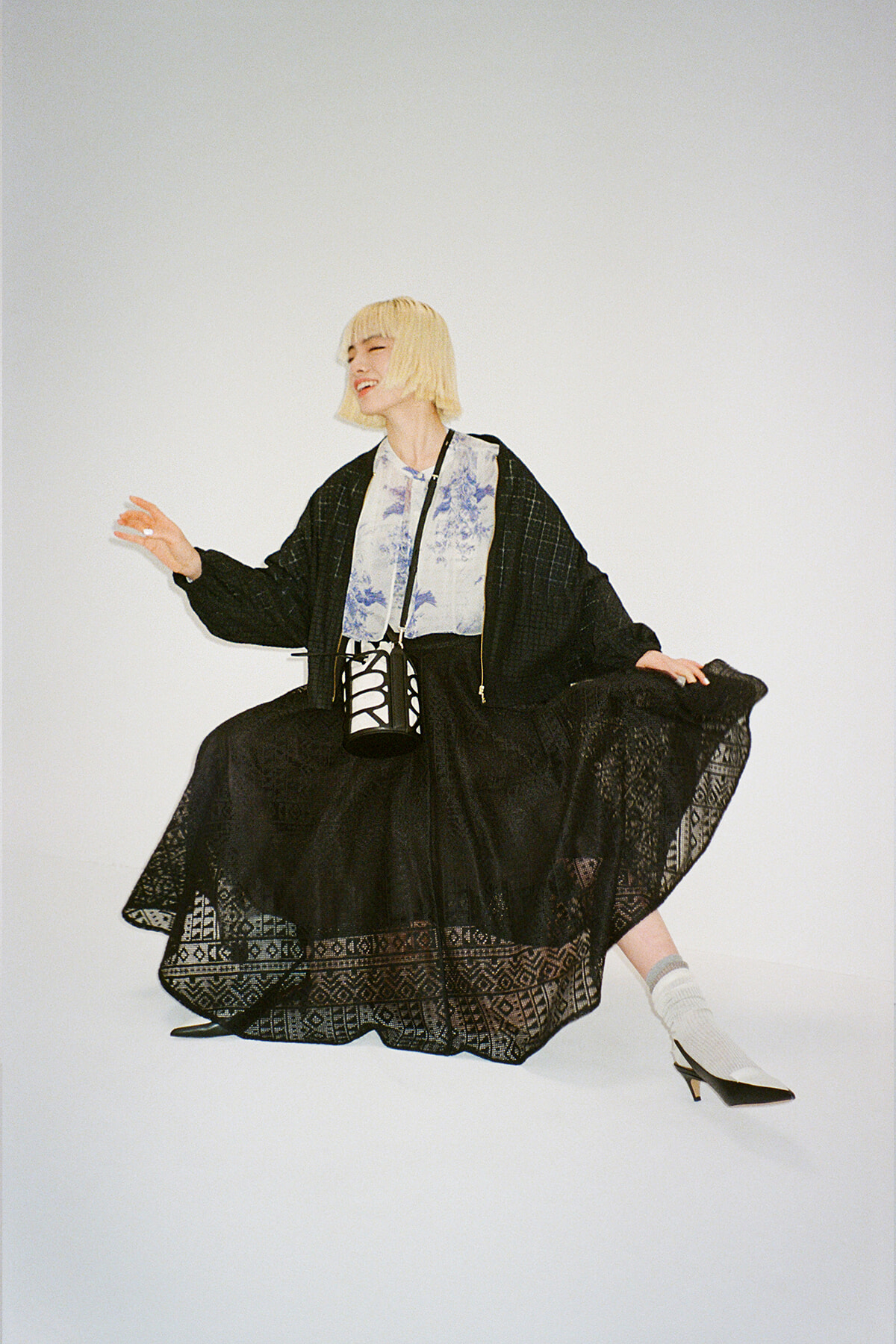 繊細な幾何学レースのMA-1風ジャケットとフレアスカートに透ける光と影。たっぷりと入れたギャザーに心地いい風がはらむシアーブラウス。そして未来を切り開く船の船首が着想源になったポインテッドトウシューズ。街も海岸線を歩くにもふさわしい、軽やかさが行き届いたスタイルには洗練が宿る。