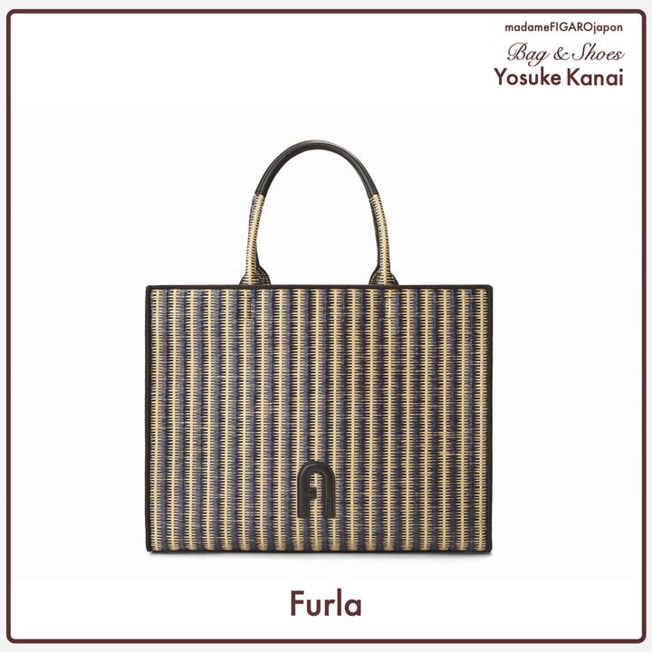 「日常的にマチありのトートバッグを愛用している」と言う金井が、バッグのウィッシュリストとして選んだのはフルラのトートバッグ。「ラフィア素材が醸し出す爽やかな雰囲気に惹かれました。編み込みで作られたストライプ、縁に施されたパイピング、ハンドル部分のレザーがシックながら存在感を示していてとても好み。ボトルに巻き付けるタイプの保冷剤をお供にシャンパーニュと白ワイン、ちょっとしたスナックやフルーツを詰め込んで、ピクニックやビーチに出かけたり、友人宅に押しかけたりしたいですね」。
