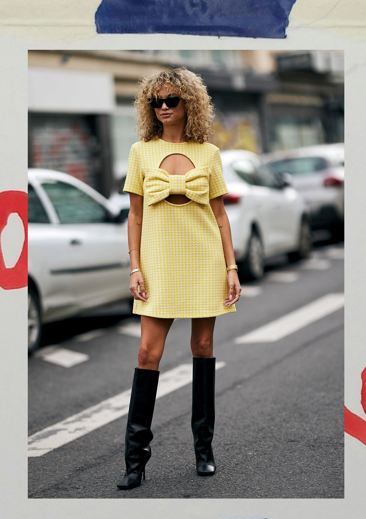 くるくるのカーリーヘアがチャームポイント! モデルのローズ・バートラムは胸元のビッグリボンがアクセントになったイエローのミニドレスでキッチュに登場。トレンド感の高いアイテムだからこそ、こんなシンプルコーディネートがハマる。