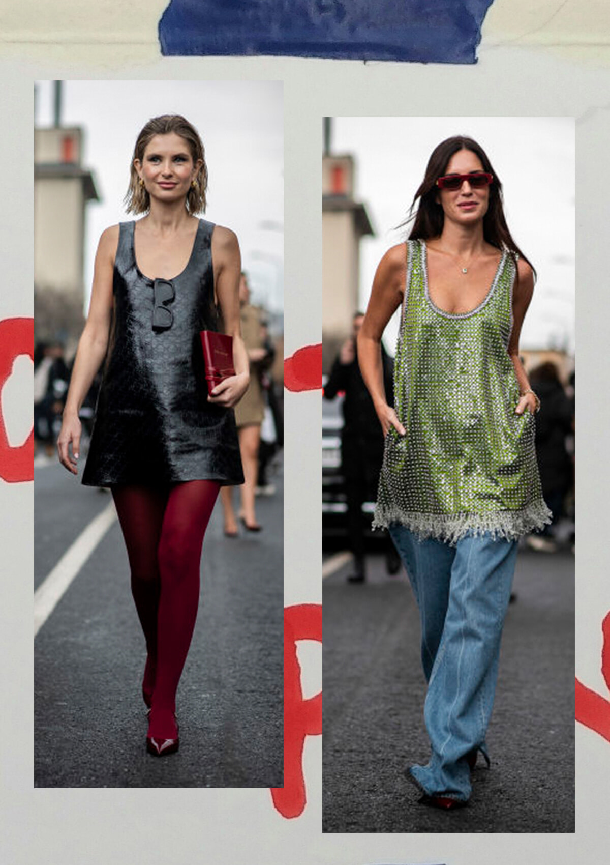二人とも、トラぺゾイドのミニ丈ドレスブームの立役者、グッチの新作を纏って。各々アンダーにはアンコーラレッドのタイツやワイドジーンズを合わせて下半身にもポイントをプラス。