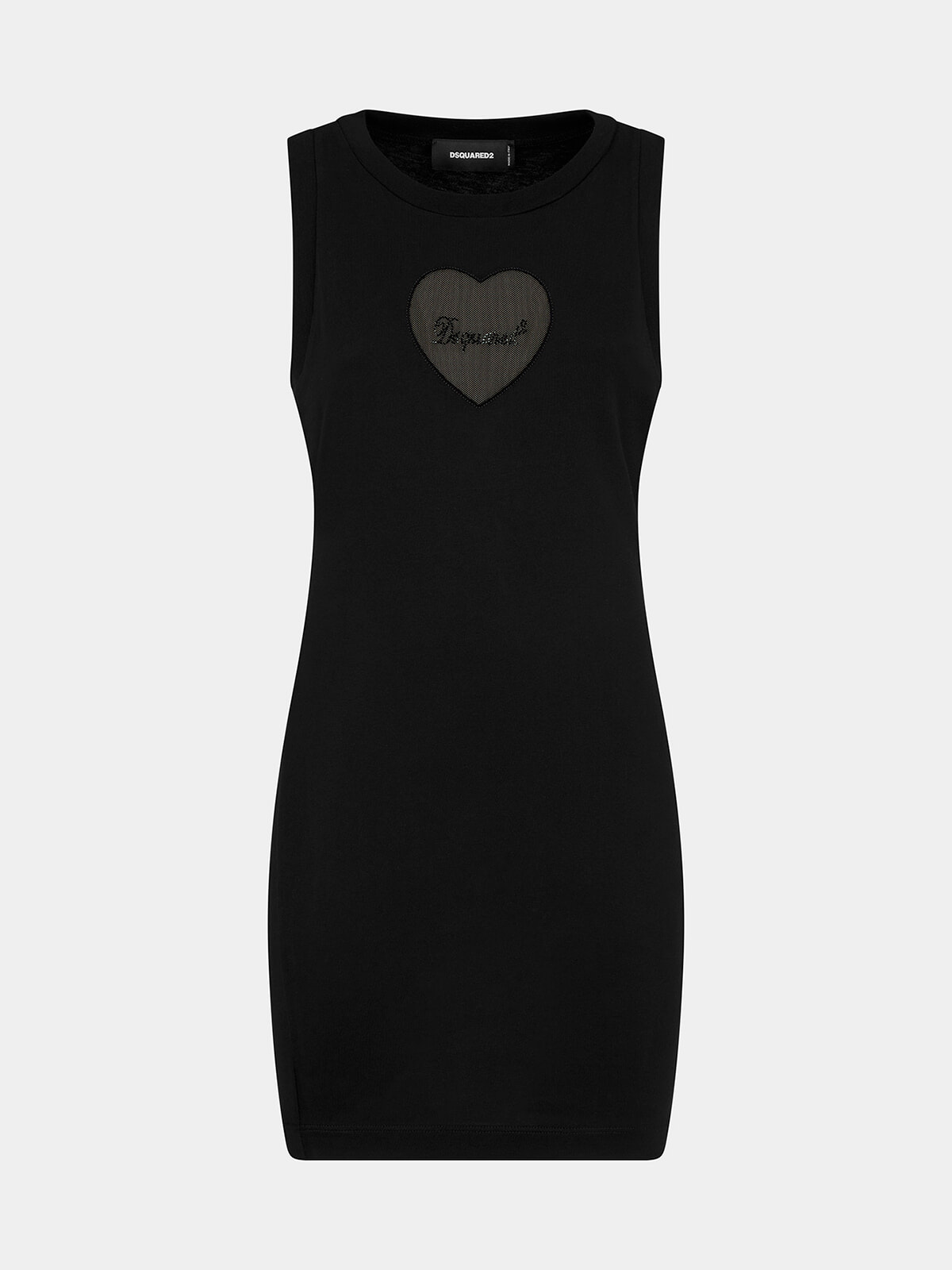 着心地が良く伸縮性にも富んだコットン製のノースリーブドレス。ハートのカッティングにはメッシュになっていて着用すると胸元にDsquared2のレタードが浮かび上がる。