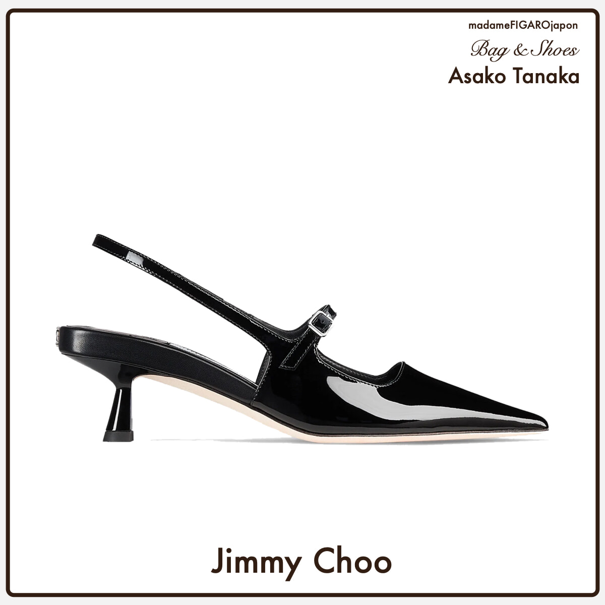 シューズは、デイリーパンプスとしてはもちろんイブニングにも使えるジミー チュウのスリングバックパンプスをセレクト。「ブラック、パテントレザー、ポインテッドトウと聞くとかなりクールな印象ですが、足の甲にかかる細く真っ直ぐなストラップのおかげでほのかに可愛らしさもプラス。素足もいいけれど、白のソックスにぜひ合わせたい」。