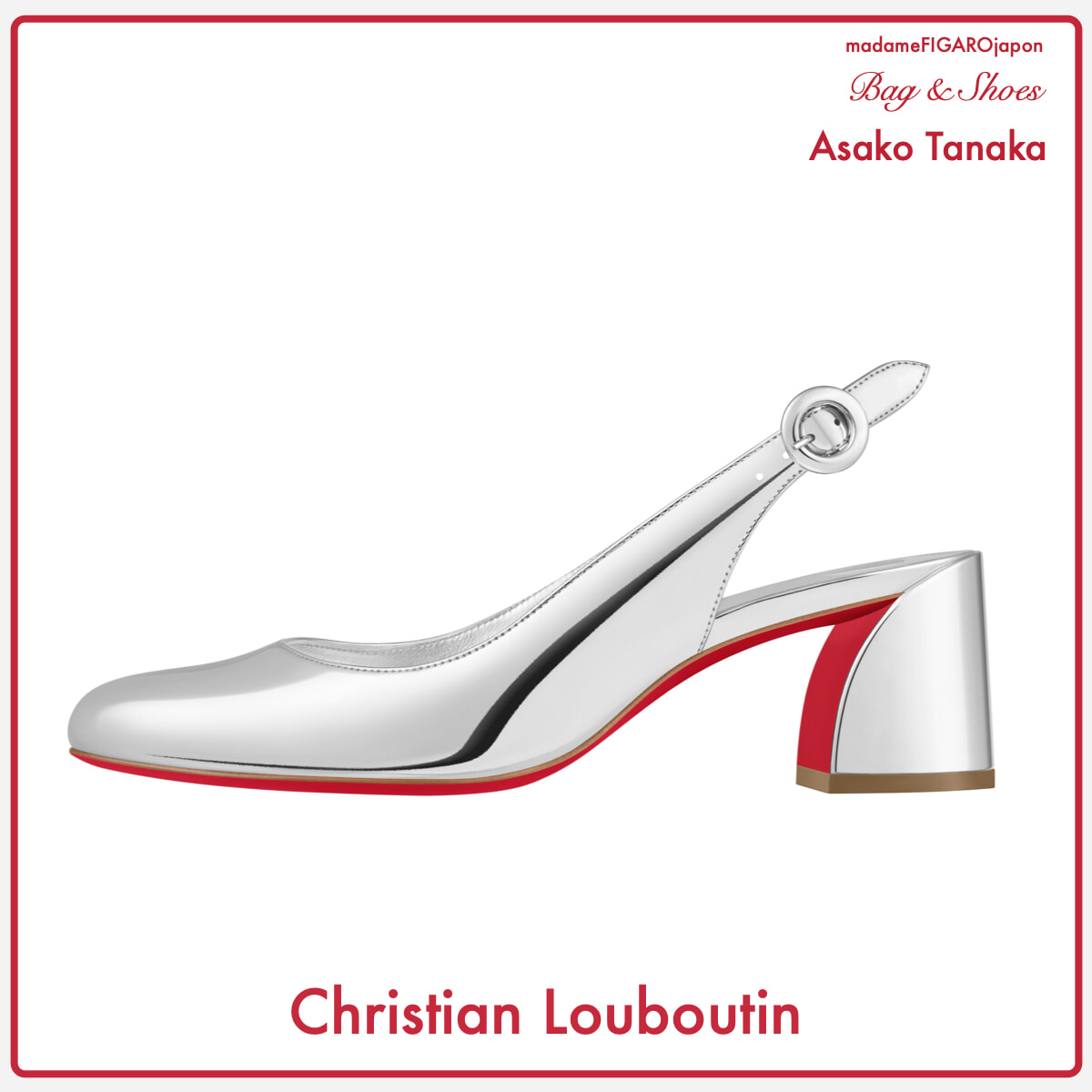 続いてクリスチャン ルブタンのタイムレスなパンプス「ソージェーンスリング」をピックアップ。「眩しいくらいに輝くエッジの効いたシルバーカラーと、アーティなヒールの曲線美! 形はシンプルでクラシックながら、モダンなディテールが施されているところに惹かれました。安定感のあるヒールかつストラップ付きで実際に履きやすそうなのも選んだ理由」。
