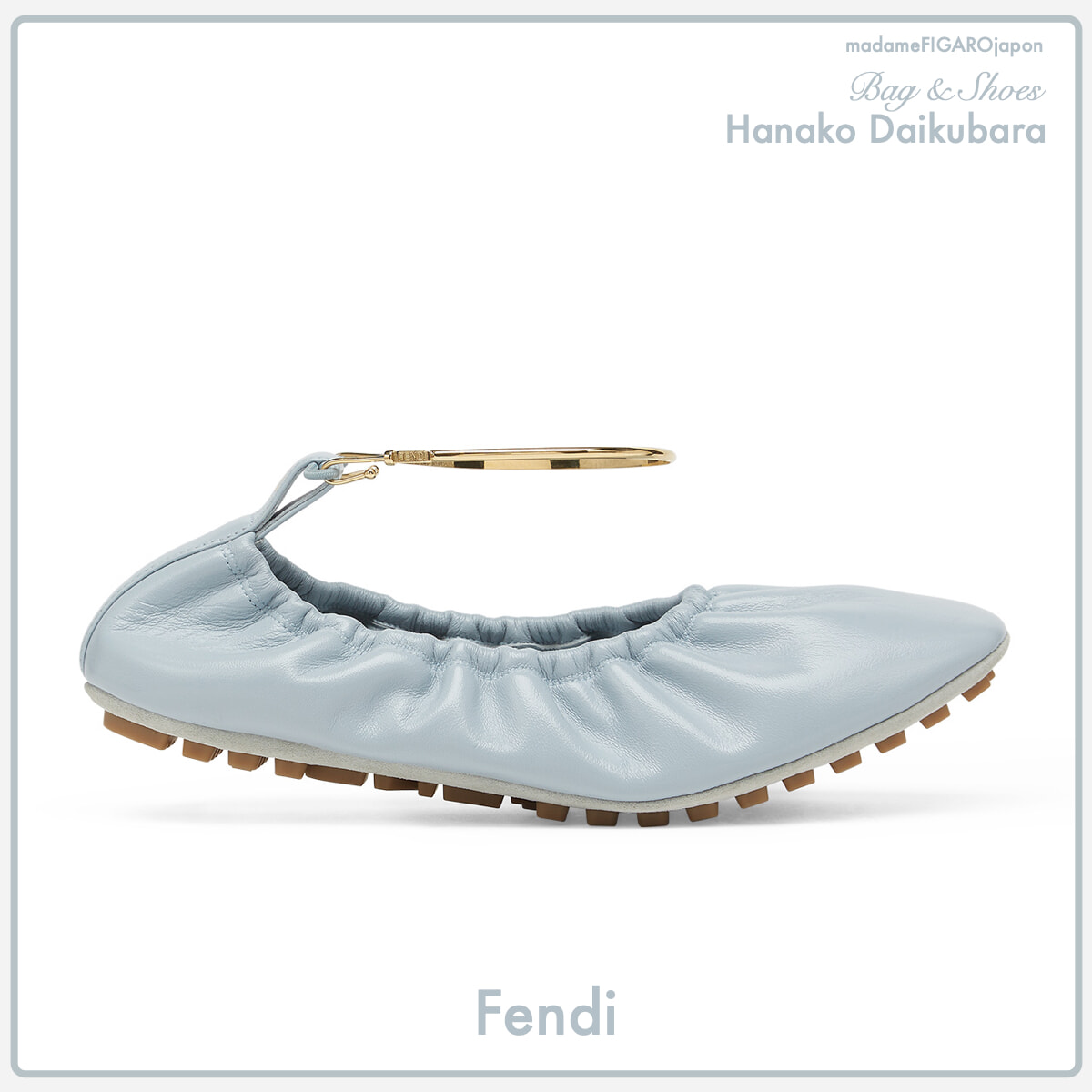 「曲線の美しさや優しさを感じるフォルムが際立つシルエットに惹かれています」と、セレクトしたのはフェンディのフラットシューズ。メタリックのアンクルストラップがモダンなアクセントに。「ギャザーを施したくるんとしたシルエットが愛らしい一足は、足なじみもよく履き心地も抜群。春らしいペールトーンで足元から彩りを添えて新しい季節を謳歌したいです」。