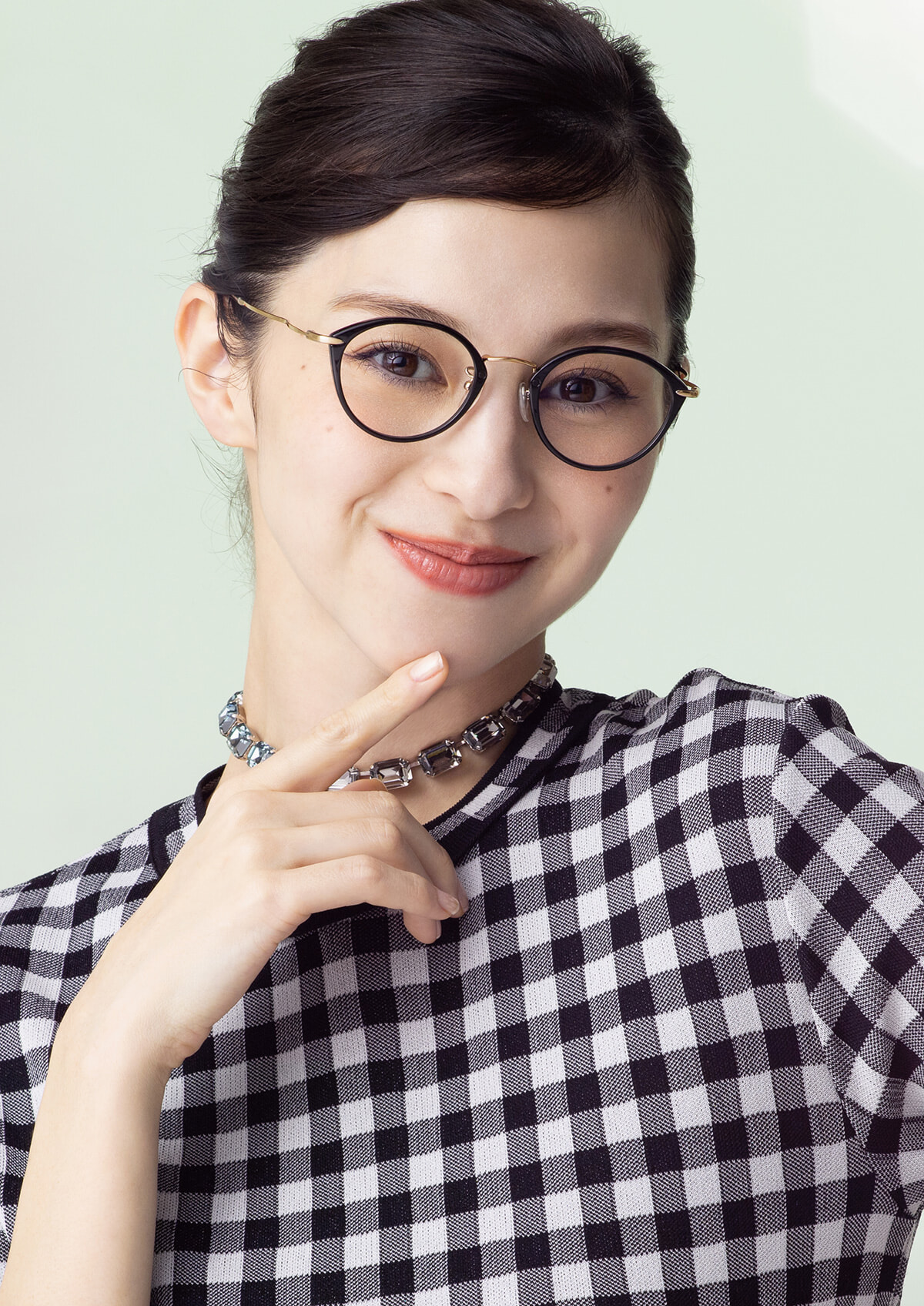 中条もお気に入りだという黒縁のSolo。柔らかなオーバルシェイプと、テンプルの細いラインの組み合わせがコケティッシュな魅力を放つ。