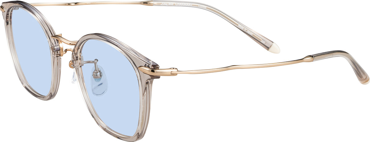 透明感のあるグレーのフレームとブルーのカラーレンズの組み合わせ。サングラススタイルは夏のアウトドアにぴったり。
