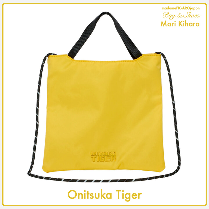 続いて選んだのは、メタルのロゴがアクセントに効いたオニツカタイガーのナイロントート。トートバッグとしてもショルダーバッグとしても使える2WAY仕様がうれしい。「キャンプやスキーなど年間を通して子どもと一緒にアウトドアアクティビティを楽しむので、ネオンカラーのバッグは必須。大自然の中で遠くにいても目立ちますし、うっかり荷物を置き忘れても見つけやすい。ワードローブもベーシックカラーが多いので、ポイントカラーとして取り入れやすいのも◎」。