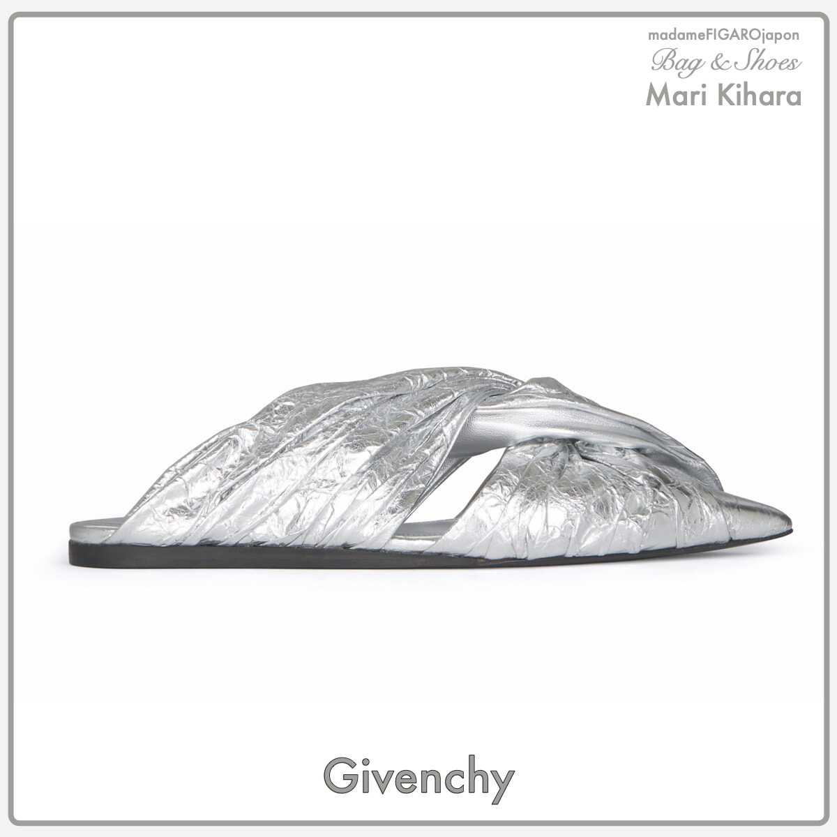 続いて、ニュアンス感とシルバーの落ち着いた輝きでこなれ感を演出できるジバンシィのフラットミュールをチョイス。「春夏のルックでも多く登場していたメタリックカラーは、小物で取り入れる派。抜け感のあるフラットなミュールは着回し力が高くヘビロテ間違いなし」。