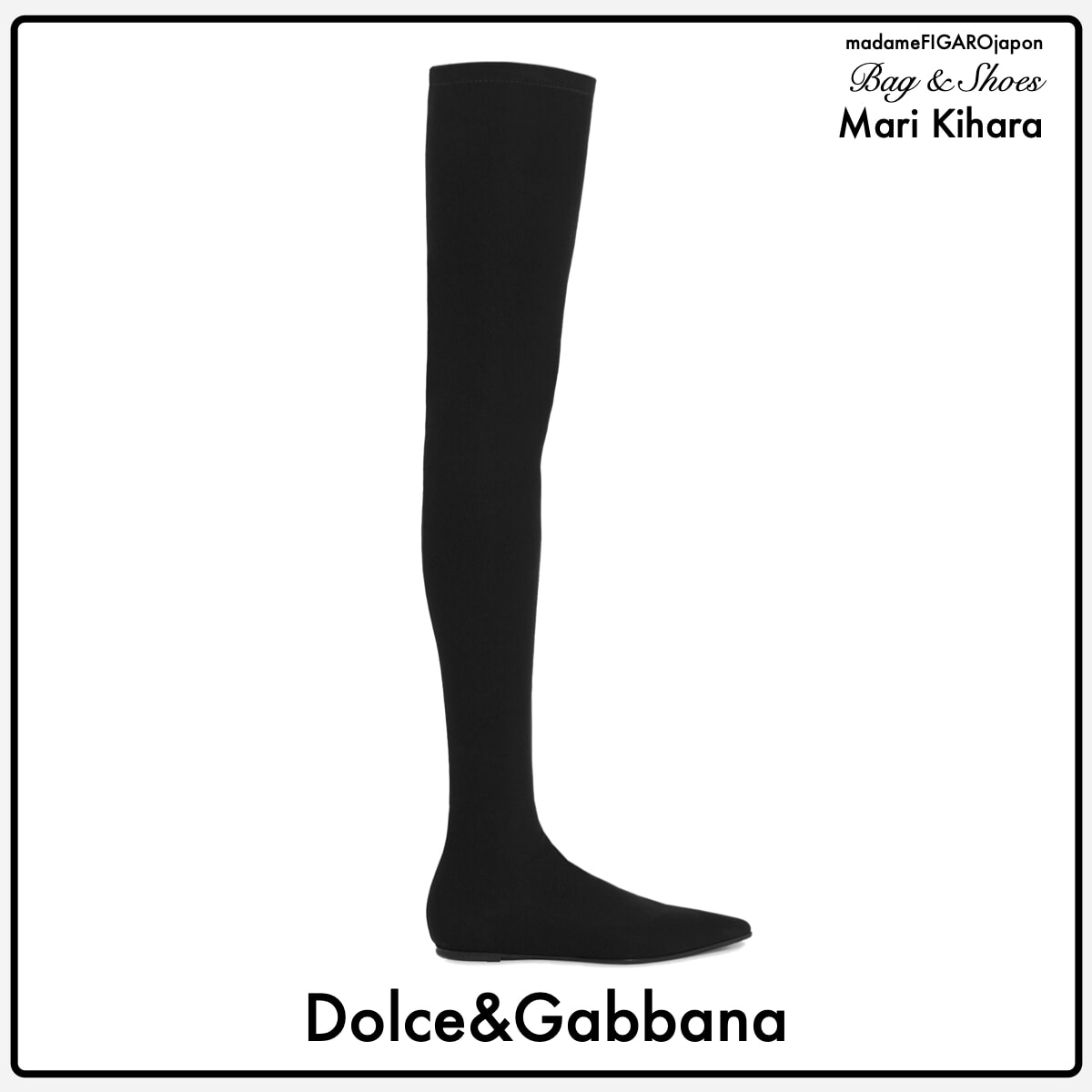 シューズは、大胆かつモダンな装いを演出するドルチェ&ガッバーナのストレッチジャージー製サイハイブーツをセレクト。「トレンドのミニ丈を素足で……はさすがに難しいので、サイハイブーツでバランスをとって着こなしたい。ドルチェ&ガッバーナのヒールなし、ストレッチジャージー素材のブーツなら、エッジが効きすぎずトライしやすい」。