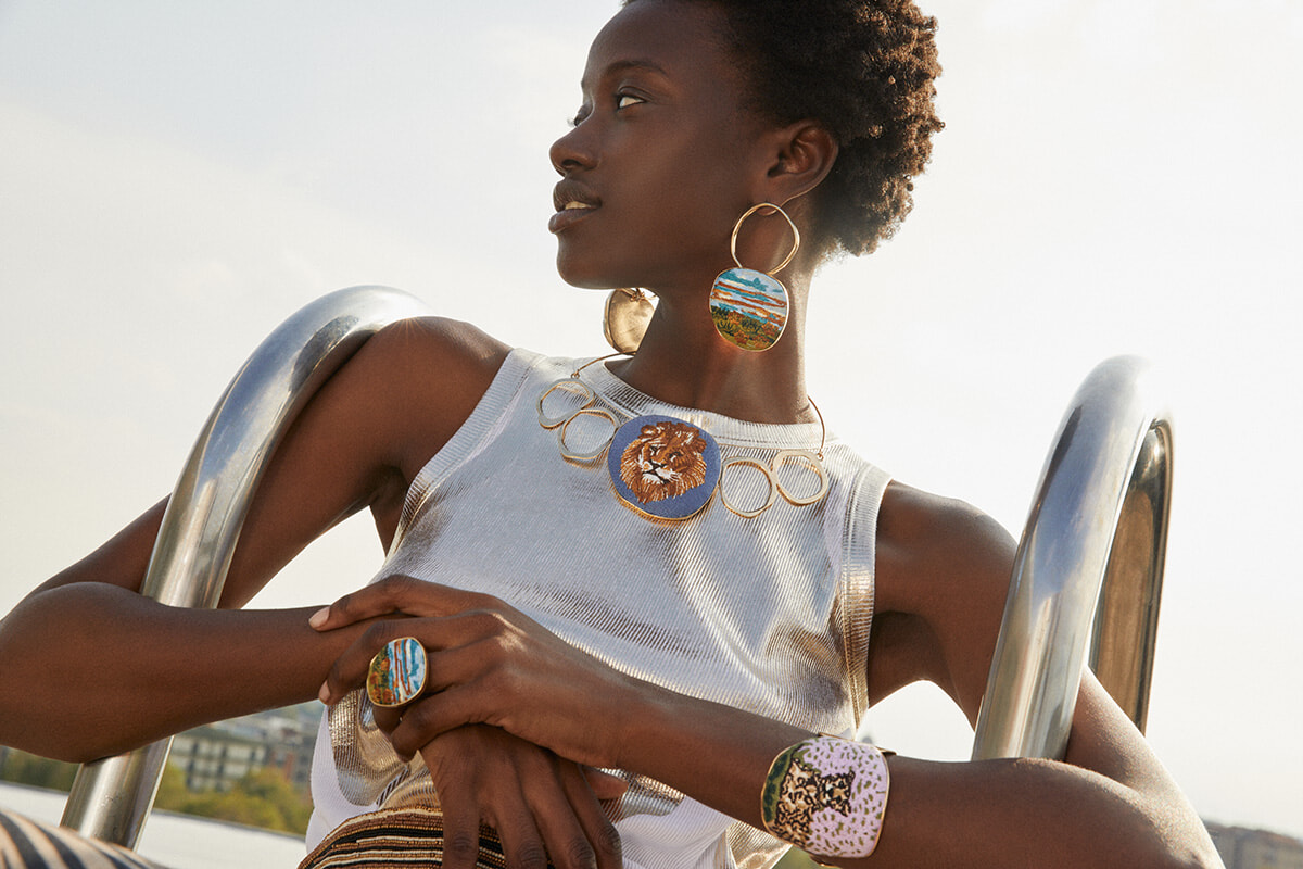 コレクションの中心となるのは、大胆なライオンのネックレス、チーターをモチーフにしたバングル、風景画を思わせるデザインのリングやイヤリング。また、ジュエリーに加えて、繊細なアップリケを施したチュールTシャツ、ゴールドのディテールをあしらったリブタンクトップ、マックス アンド コーのロゴTシャツなども展開する。
