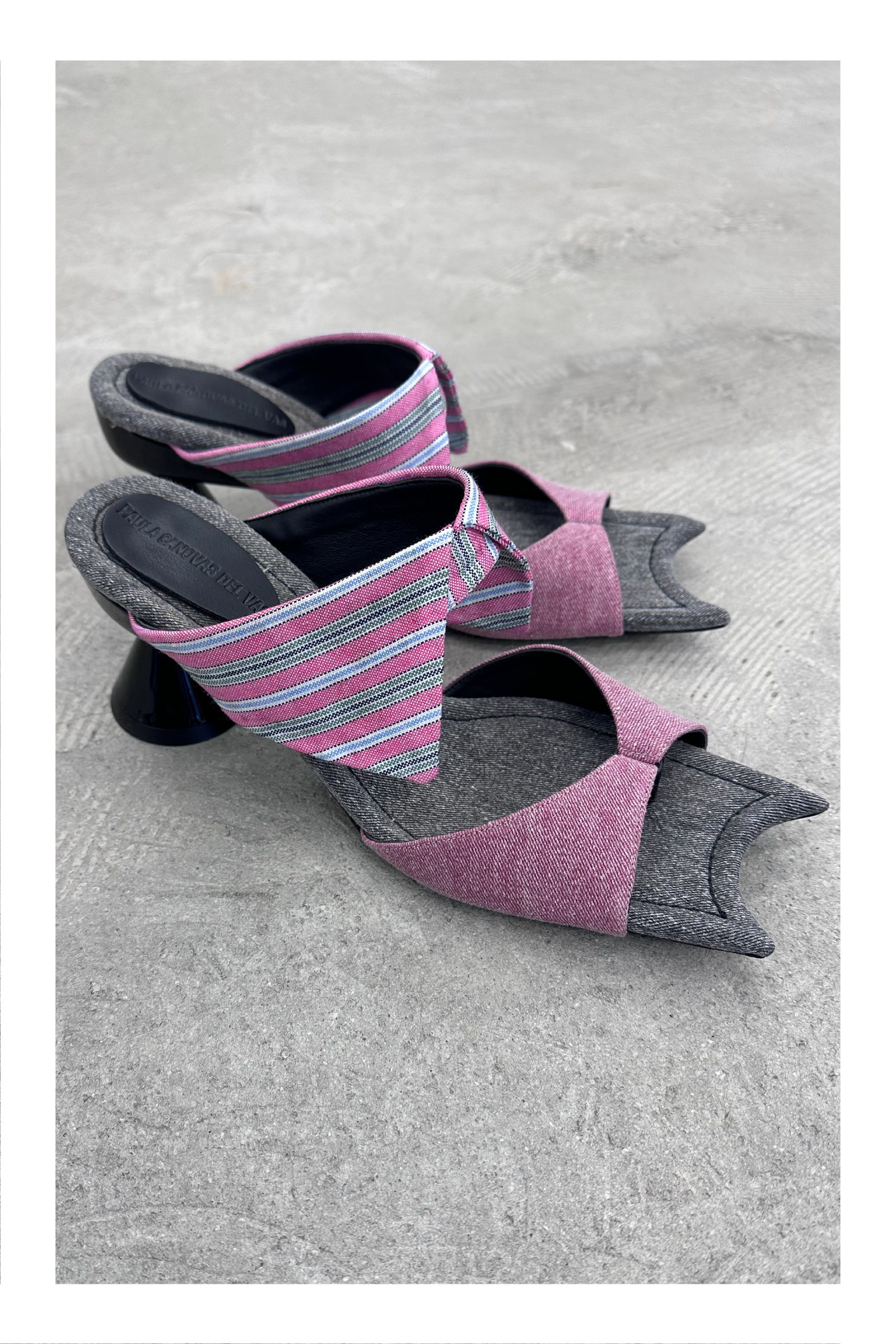 色染めしたブラックとピンクのデニムとシャツの襟のようなストライプ生地の組み合わせ、フォルムコンシャスなヒール部分など、全体的に遊び心が散りばめられた一足は、春の足元をキャッチーに彩ってくれること請け合い。