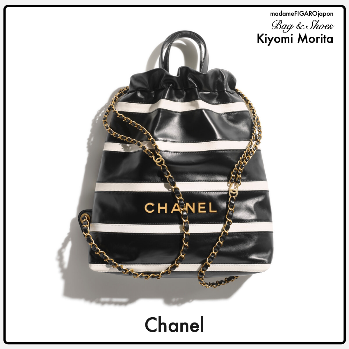 シャネルの新しいアイコンバッグ「シャネル 22」をウィッシュリストに追加。「モノがたっぷり入るサイズ感。そしてブラック&ホワイトというシャネルのコードでもあるカラーを、ストライプという今季のトレンドで仕上げているところが魅力的。バックパックというのもユニークだし、チェーンストラップが両肩にかかっているスタイルはボディアクセサリーみたいな印象にもなってコケティッシュ!」