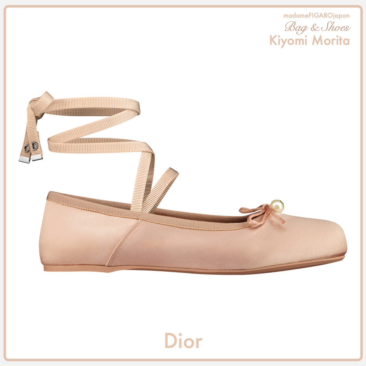 「今季は、バレエシューズが人気メゾンから多数登場。活動的かつベーシックかつ可憐な足元のスタイリングが好きな人にとっては、まさに「買い」の時期!」と語る森田が、そのトレンドの中で特に気になったのはディオールの一足。「ブラックか迷いますがピンク色にロックオン。トウの部分のスクエアのフォルムやアンクルストラップまでまさにバレリーナ風で、パールとリボンのアクセントも愛らしい。ドレスなど甘口の洋服と合わせるのは王道だけれど、ジャケット&パンツスタイルでも合いそう。そして、ベーシックなのに案外目を引く足元を演出できるのが、バレエシューズの特権だと思います」