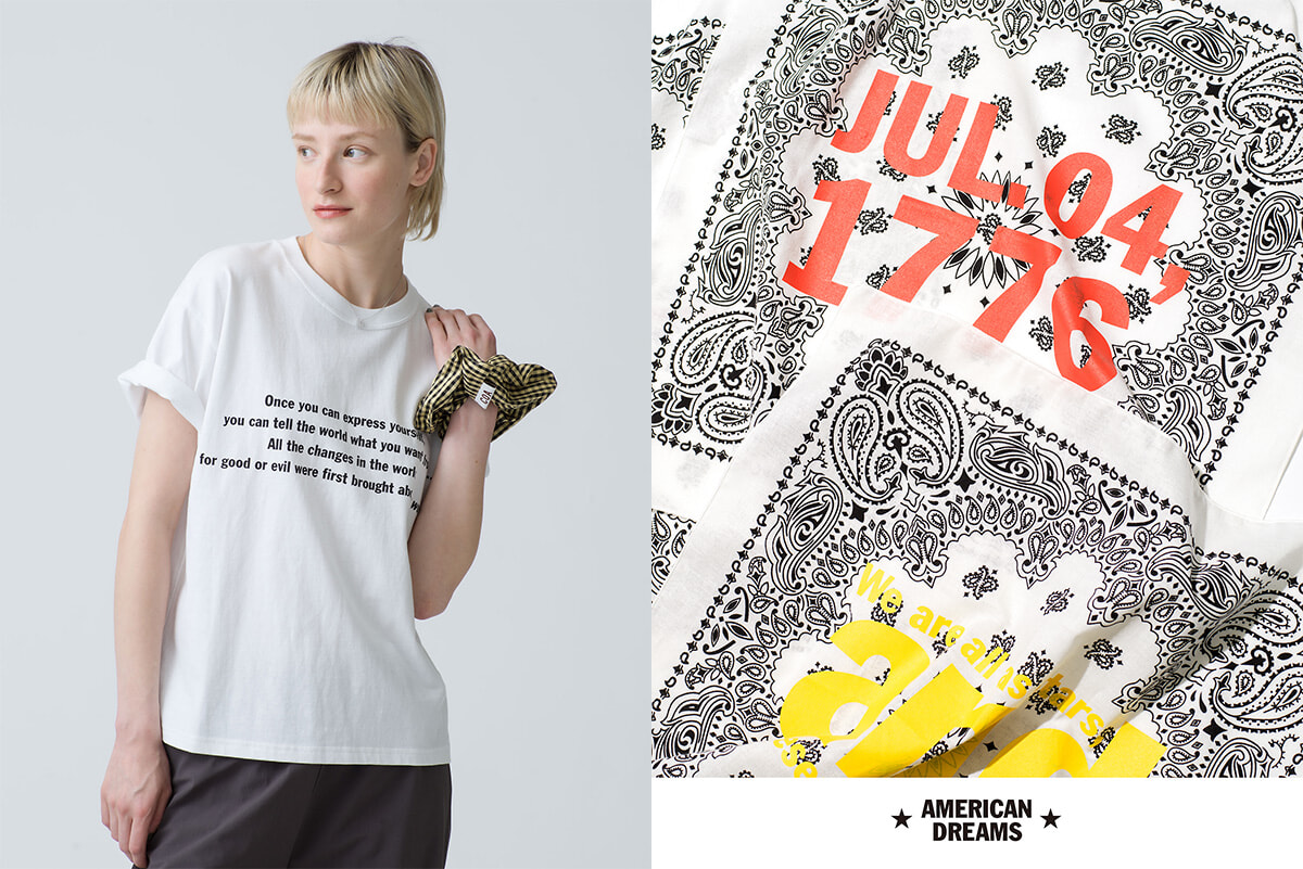 左:アメリカを代表する著名人が残した言葉や企業のスローガンなどをプリントしたTシャツは、あえてモノトーンでシックに仕上げて。オリジナルグッズはRHC ロンハーマン、ロンハーマン「R」各店およびオンラインストアでも展開。Tシャツ¥7,700 右:バンダナはバッグに結んだり、デニムパンツのポケットから覗かせたり、腕や首に巻いたり……。多様なスタイルで楽しんで。バンダナ各¥1,650(以上4/27発売)/以上アメリカン ドリームズ(RHC ロンハーマン)