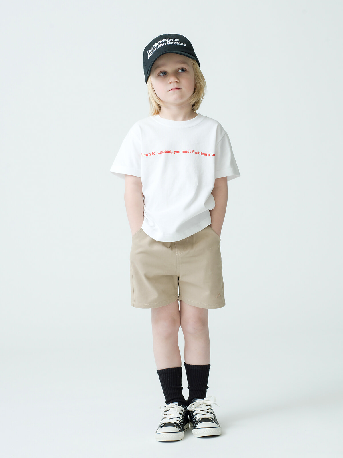 キッズのTシャツはトートやバンダナと同様に、ロゴのイメージに合わせて10色異なるカラーリングが揃う。110cmと130cmの2サイズで展開。Tシャツ¥6,600、キャップ¥4,950(ともに4/27発売)/ともにアメリカン ドリームズ(RHC ロンハーマン)