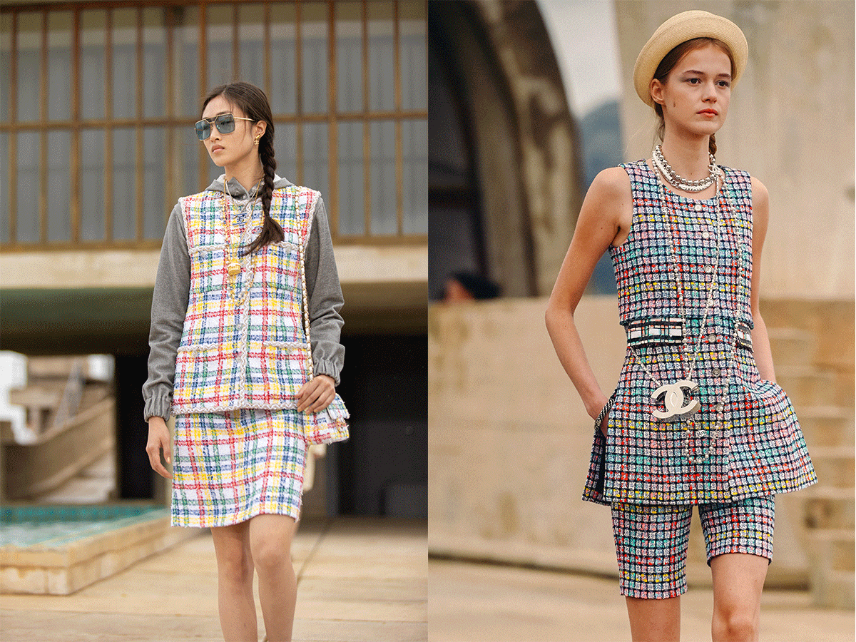 フードが付いたチェック柄のスリーブドレスやシースルードレスにあしらわれたカンガルーポケットも印象的。この躍動感あふれるコレクションを完成させるのは、刺繍を施したブレードでトリミングしたランニングバミューダショーツや、ツイードのサイクリングショーツ、そしてオーバーサイズのベースボールジャケットといった軽やかなアイテムたち。