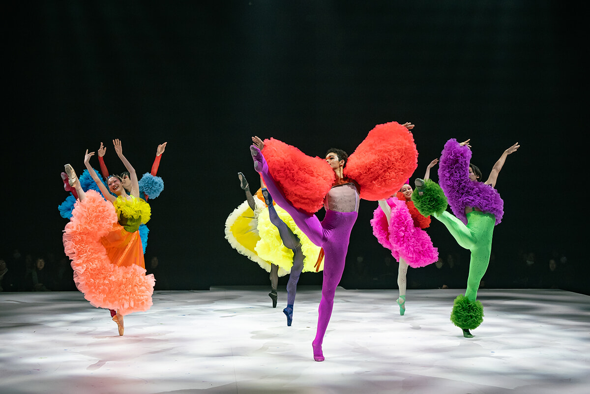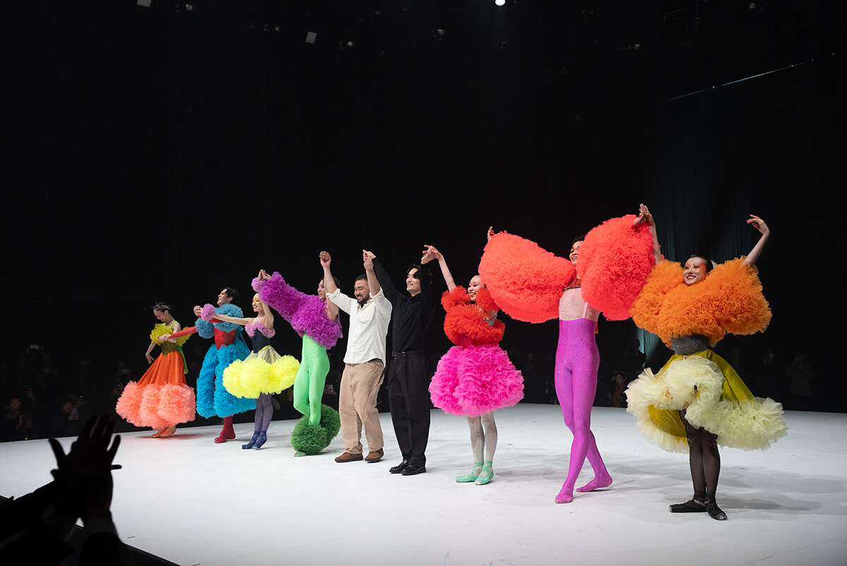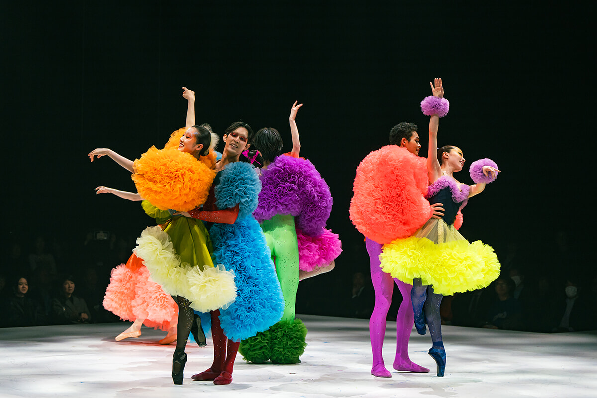 この数ヶ月の間に、小泉さんはKバレエ トウキョウの堀内將平さんとともに初体験の衣裳創作とステージ演出を作り上げていたわけだが、その「苦労話」を聞く前に目の前に現れたバレエダンサーたちを見て、私は冒頭に述べたように、まるで花や妖精が舞うかのようなファンタジーの世界にいきなり引き込まれた。TOMO KOIZUMIのアイコンであるフリルのボリュームと鮮やかな色彩たちが、卓越した身体能力を持つバレエダンサーたちの、この上なく鮮やかで美しい動きと重なるとき、現実感が遠ざかり、どこか夢のような異世界に誘われてゆくのを感じた。