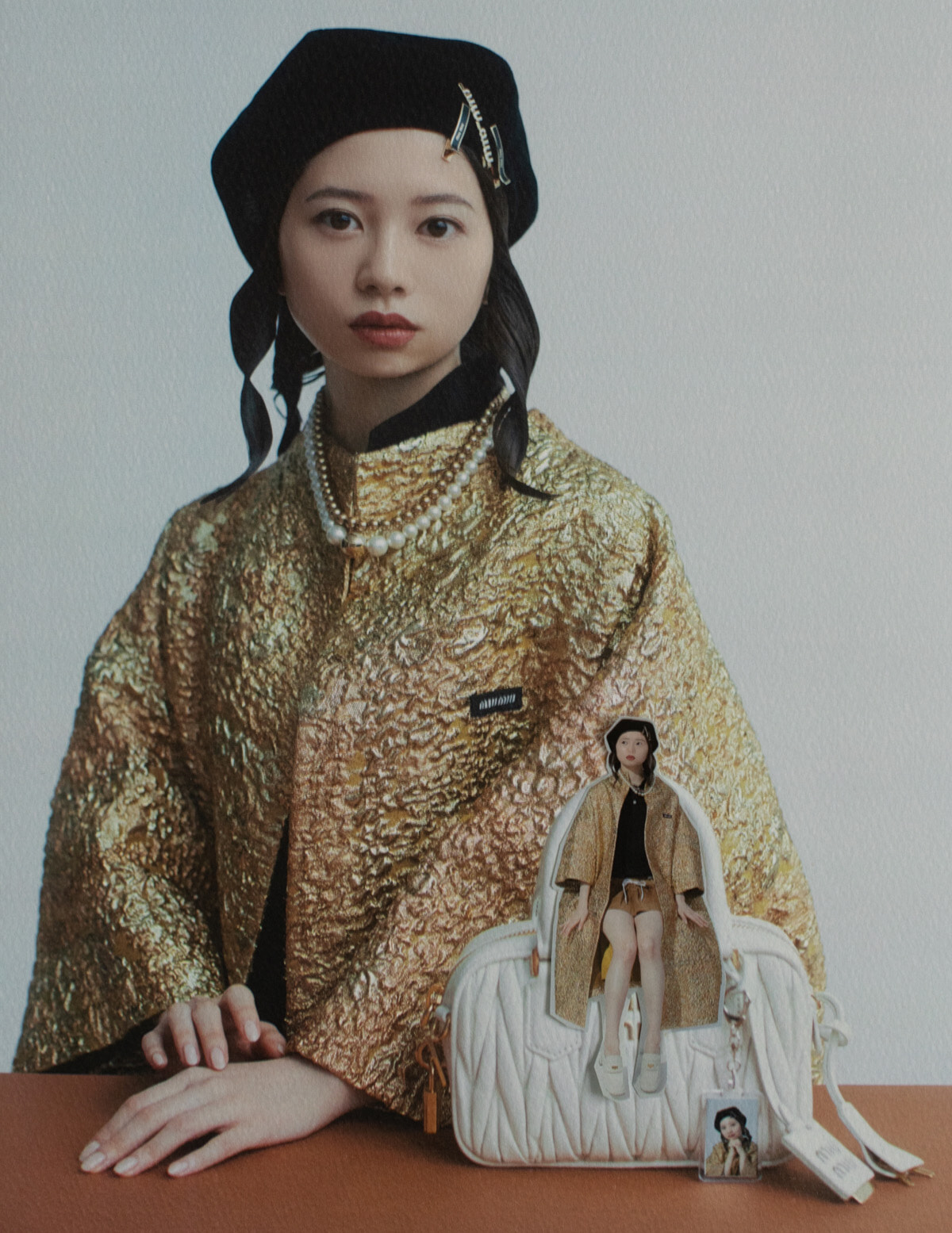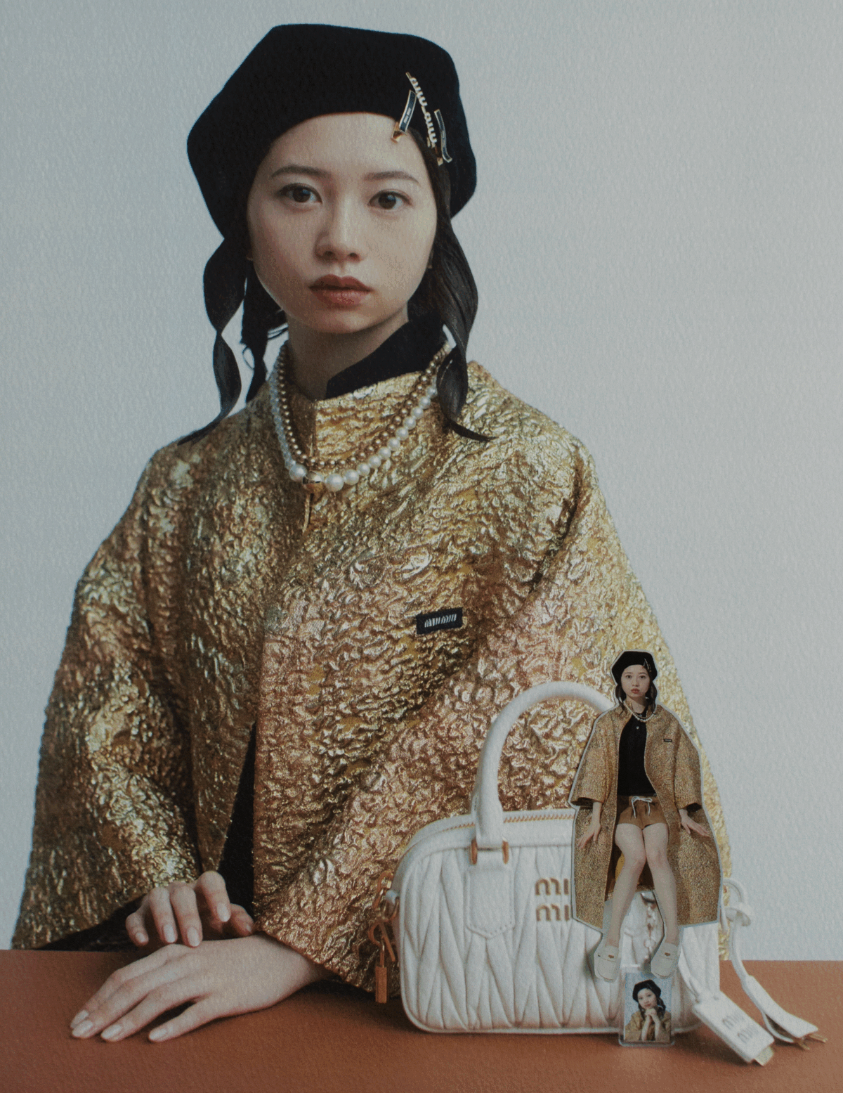 艶めくゴールドが心を優しく守る鎧代わりとなり、そっと背中を押す。「ヒーロー全員が最初から強いわけではない」と語る桜田ひよりの前には、20歳を越えて新しい世界が広がり始めている。「前に出るタイプではないのですが、好きなことや発信したいことは持ち続けたい」と、自分だけの物語を創っていく。コート¥1,265,000、ポロシャツ¥140,800、パンツ¥412,500、ベレー帽¥79,200、ヘアクリップ(黒、2個セット)¥70,400、ヘアクリップ(白)¥48,400、ネックレス¥147,400、シューズ¥161,700、バッグ¥357,500(すべて予定価格)/以上ミュウミュウ(ミュウミュウ クライアントサービス))*「フィガロジャポン」2024年6月号より抜粋
