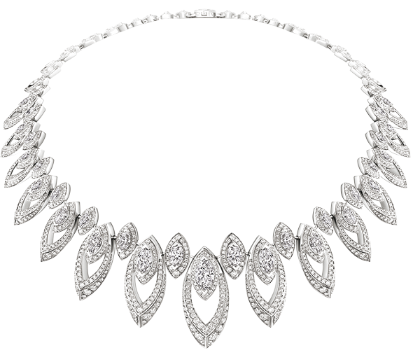 マーキスカットのダイヤモンドを中心に、2重のトリミングが輝きをより効果的に放ち、ふんわりとした羽根の印象を生み出す。「ミッドナイト サン」ネックレス(WG×ダイヤモンド)¥35,310,000/メシカ(メシカジャパン)
