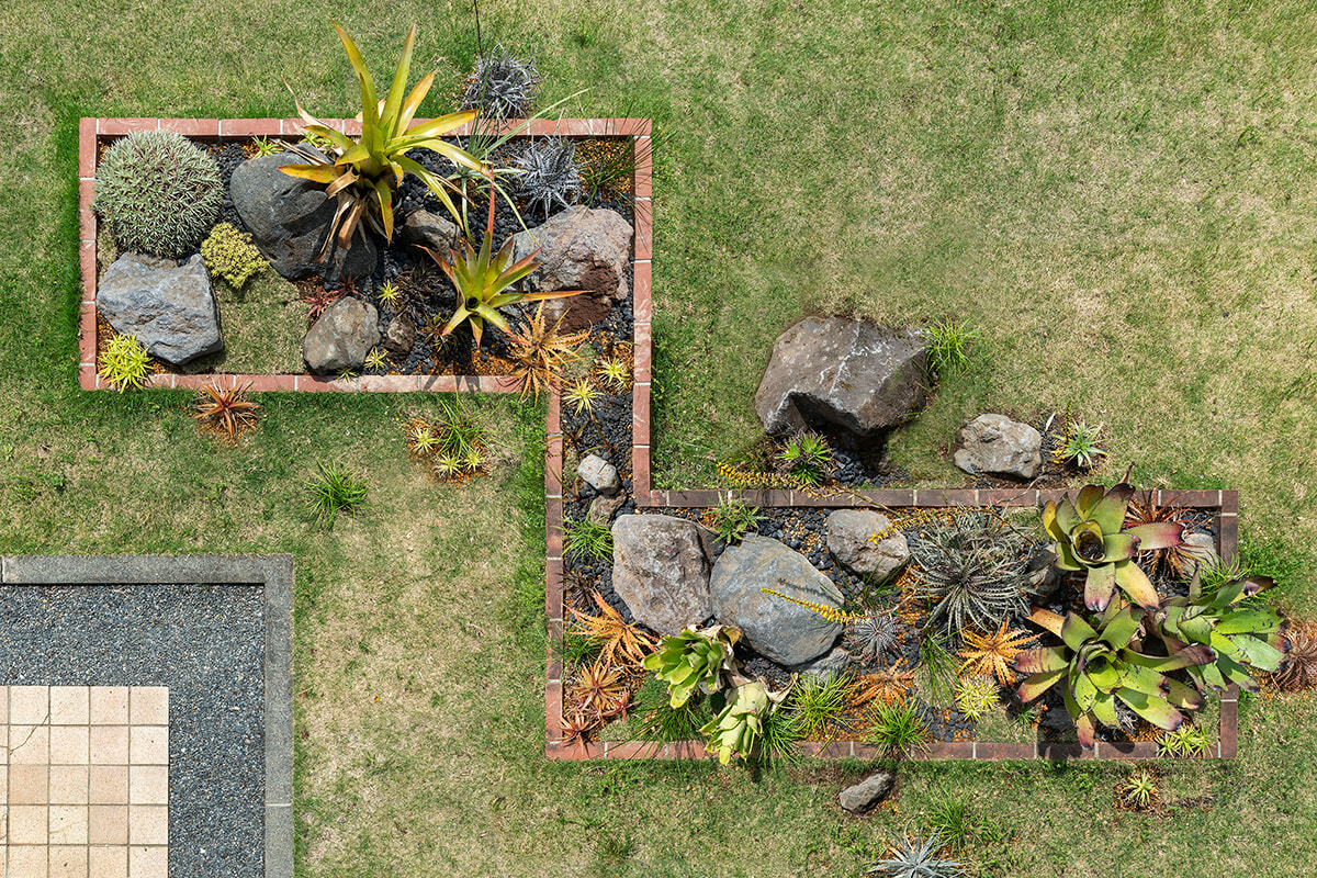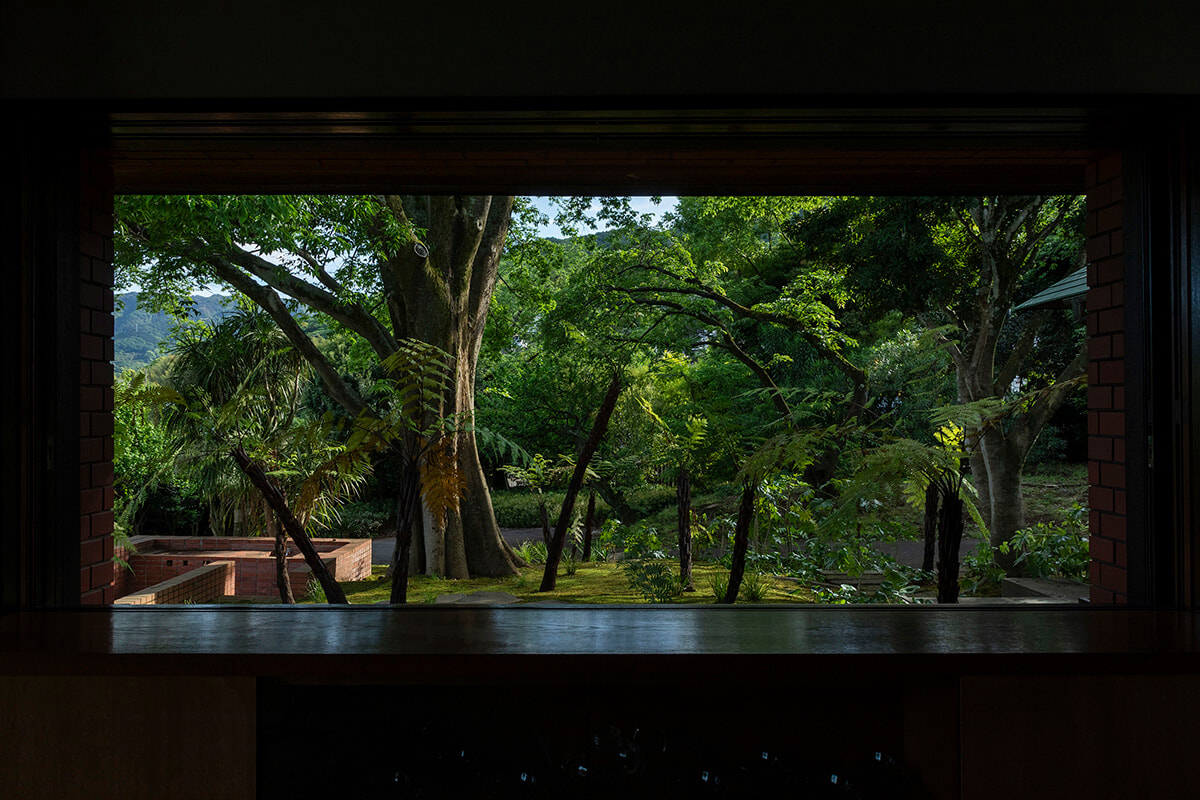 そしてこの夏、トゥ エ モン トレゾアの歴史に対する視点に共鳴したカクタス ストアは、時の経過とともに次第に焦点を失った庭園に込められた吉村の思想を、現代の文脈に再び蘇らせようと試みる。かつてお手伝いさんの作業場として使われていたキッチン裏の空間と庭園を隔てていた高い生垣は取り払われ、生き生きとしたディクソニアが、内部空間と庭園のゆるやかな境界をつくりだす。限られた種類の植物を考え抜かれた配置によって構成する庭園は、伝統的な日本庭園やモダニズム建築のための多くの庭園をデザインした、ブラジル人ランドスケープデザイナー、ロバート・ブール・マルクスの作品から着想を得たもの。ダイニングから芝生に開けた大きなガラス戸の外にある、赤、青、黄のディッキアが植えられた花壇は、かつて施主である女性実業家が植えた色とりどりの花々と、趣味の園芸の温かさを想起させる。