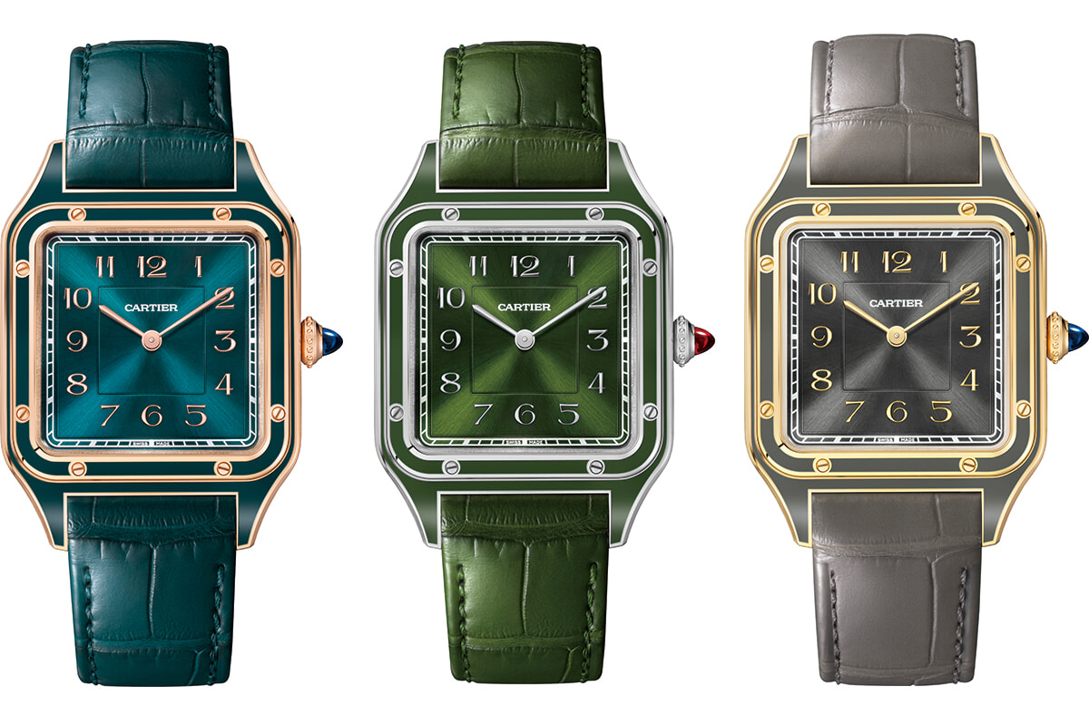「サントス デュモン」2024年9月発売予定。左:(ピンクゴールド製ケース、ブルーダイアル、ブルーアリゲーターレザーストラップ)¥2,455,200(予定価格) 中:(プラチナ製ケース、グリーンダイアル、グリーンアリゲーターレザーストラップ、世界限定200個)¥3,458,400(予定価格) 右:(イエローゴールド製ケース、トープグレーダイアル、グレーアリゲーターレザーストラップ)¥2,455,200(予定価格)/カルティエ © Cartier