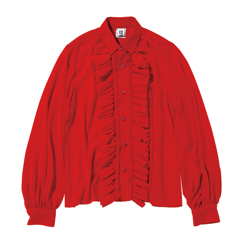 かすかに透けるポリエステル素材のシアーな質感とフロントのラッフルがロマンティック。ブラウス¥50,600/ノワール ケイ ニノミヤ(コム デ ギャルソン)