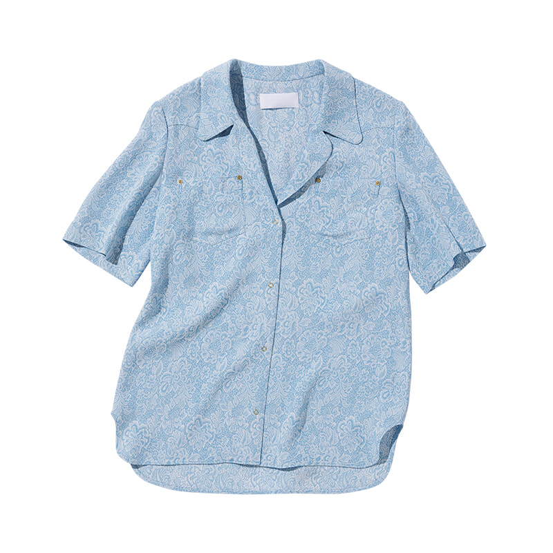オリジナルの花柄デザインが陽刻のように浮かび上がるオープンカラーシャツ¥57,200/マメ クロゴウチ(マメ クロゴウチ オンラインストア)