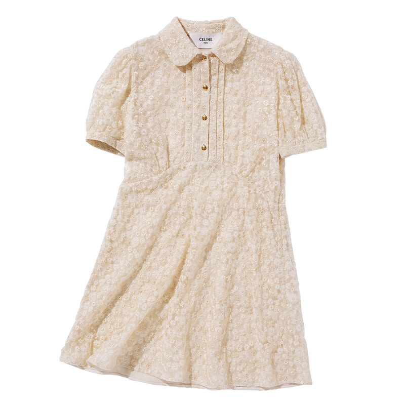 フローラルレースにはさりげなくトリオンフモチーフがちりばめられている。ドレス¥517,000(予定価格)/セリーヌ バイ エディ・スリマン(セリーヌ ジャパン
