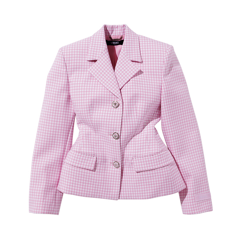 チェック柄のクラシックなジャケットは、アワーグラスシルエットでキュートな仕上がりに。¥507,100/ヴェルサーチェ(ヴェルサーチェ ジャパン