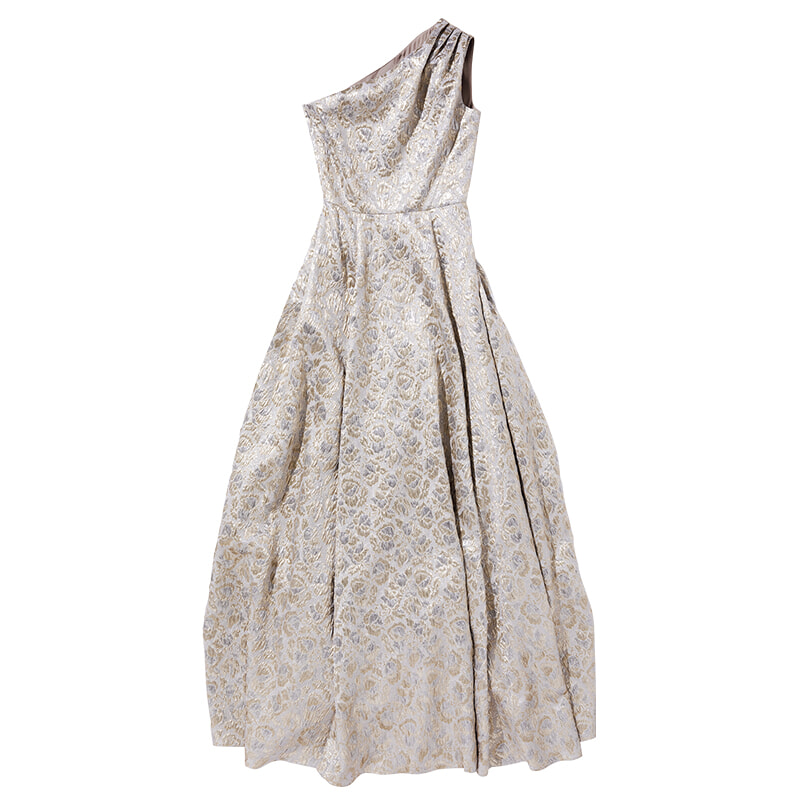 ゴージャスなワンショルダーデザイン。シャイニーな素材の上にフラワーモチーフが浮かび上がる。ドレス¥553,300/アーデム(メゾン・ディセット