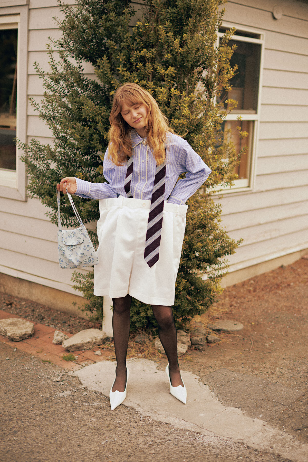 パンツ¥45,100/ノワール ケイ ニノミヤ(コム デ ギャルソン) シャツ¥69,300/インク(ユナイテッドアローズ 原宿本店) ネクタイ¥29,700/ステファノビギ(オールド イングランド銀座店) ネックレス¥41,800/リジーフォーチュネート(トゥモローランド) バッグ¥25,300/ブロンズエイジ(スティーブン アラン シンジュク) パンプス¥132,000(予定価格)/アクネ ストゥディオズ(アクネ ストゥディオズ アオヤマ) タイツ/スタイリスト私物