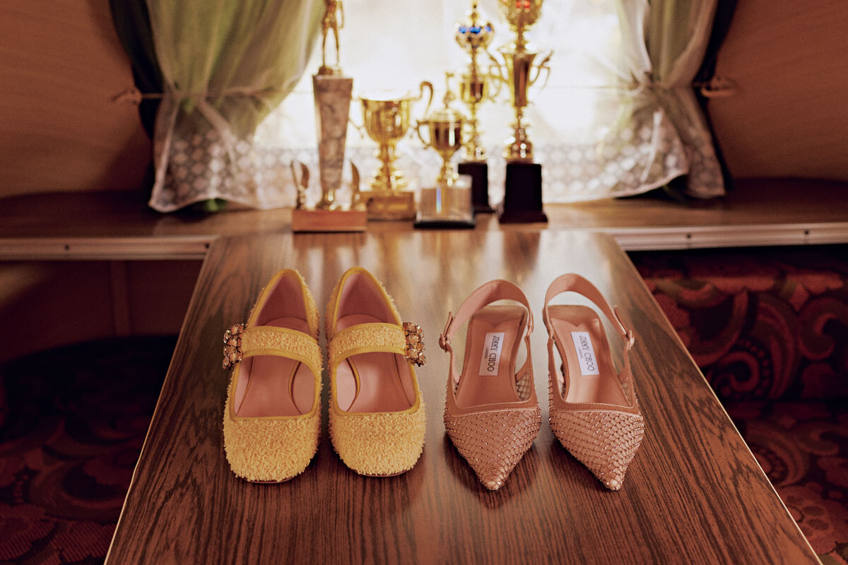 「キラキラとふわふわ、透け感など、今年らしいロマンティックな要素が詰まったシューズ。メリージェーンというアイテム自体も好きで、バックルにビジューをあしらった夢々しい一足は、パステルカラーのイエローが新鮮な面持ち。繊細なクリスタルで彩られたシューズは、ポインテッドトウでレディな雰囲気。透け感があるのでソックスを合わせて、少しカジュアルに履くのがおすすめです」