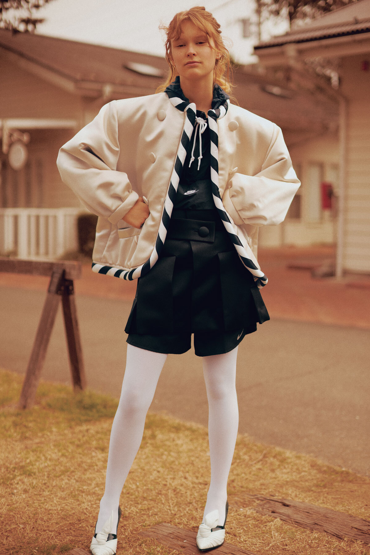 ジャケット(商品はバニラ色で展開、ブラック&ホワイトのトリムはなし)¥1,028,500(参考価格)、スカート¥577,500、パンプス(参考商品)/以上ルイ・ヴィトン(ルイ・ヴィトン クライアントサービス) 中に着たブルゾン¥10,560、ショートパンツ¥5,280/ともにナイキ ACG(ナイキ カスタマーサービス) タイツ/スタイリスト私物