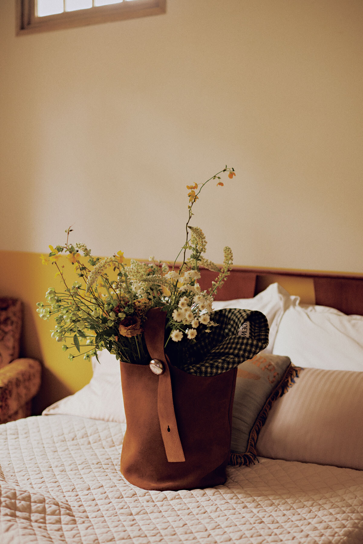 バッグ(H33×W28×D28 ㎝)¥397,100、バッグの中に入れたジャケット¥327,800/ともにロエベ(ロエベ ジャパン クライアントサービス) 花のブーケ¥40,000〜/ホール
